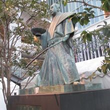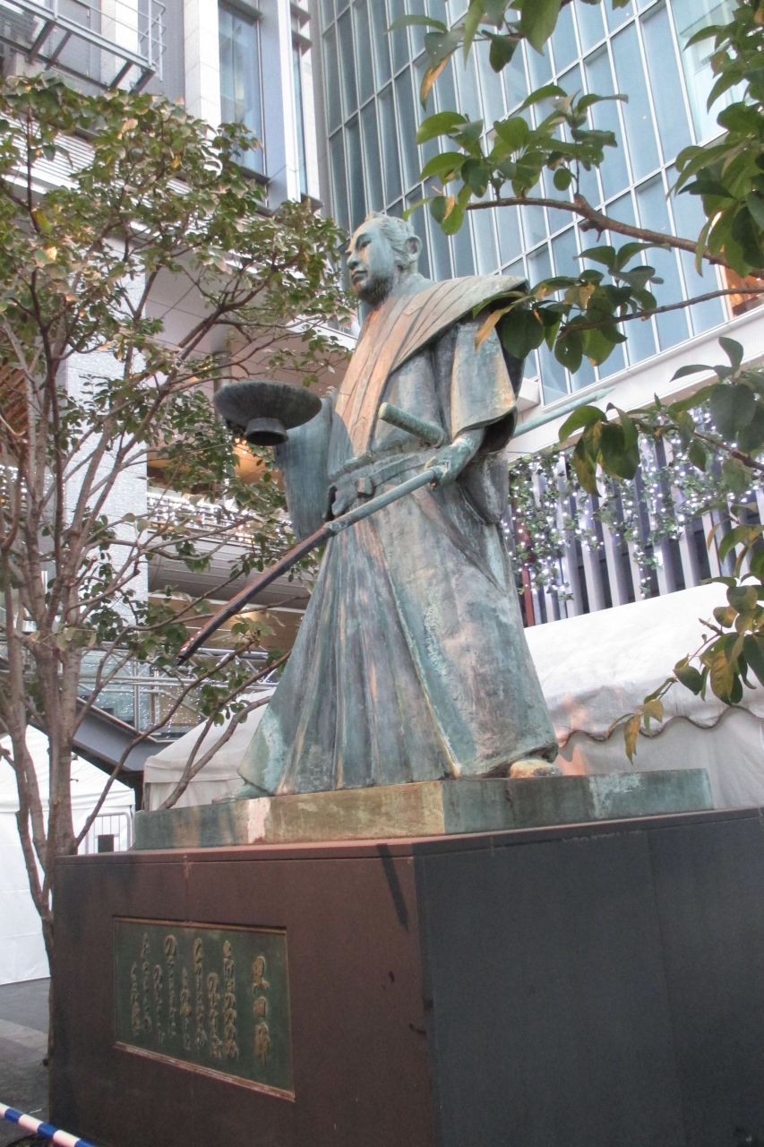 黒田節銅像は博多駅博多口の前、派出所の並びにありました。福岡県民謡「黒田節」に唄われる通り、右手には大杯、左手には名槍「日本号」を持っていました。黒田節のモデルは、黒田二十四騎のひとり・母里太兵衛だそうですね。福島正則から勧められた大盃の酒を何杯も飲み干し、正則自慢の名槍・日本号を貰い受けた逸話です。