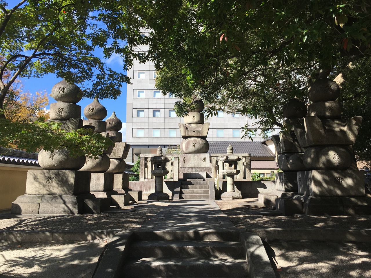 東長寺は、地下鉄祇園駅下車直ぐのところにある真言宗の寺院です。弘法大師が日本で最初に創建した寺院とのことです。境内には、福岡藩主黒田家の墓所があります。ここには、真言宗に帰依した黒田家二代忠之、三代光之、八代治高の藩主が葬られています。高さ約5.4~5.8mの花崗岩製の巨大な五輪塔です。塀の外からも一部が見える大きなものです。忠之の墓前には殉死した5人の家臣の墓碑が並んでいます。この3藩主以外の墓は、臨済宗崇福寺にあります。興味がある方は巡られては如何でしょうか。