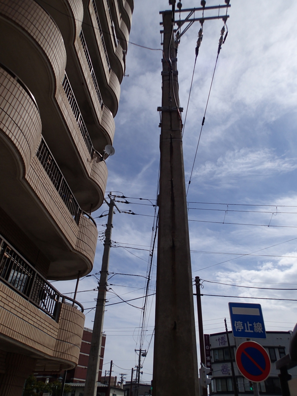 鉄筋コンクリート造りで建てられた、拓殖銀行函館支店の建物の形状に合わせて、四角い電柱が建てられました。費用も銀行が資金提供したそうです。