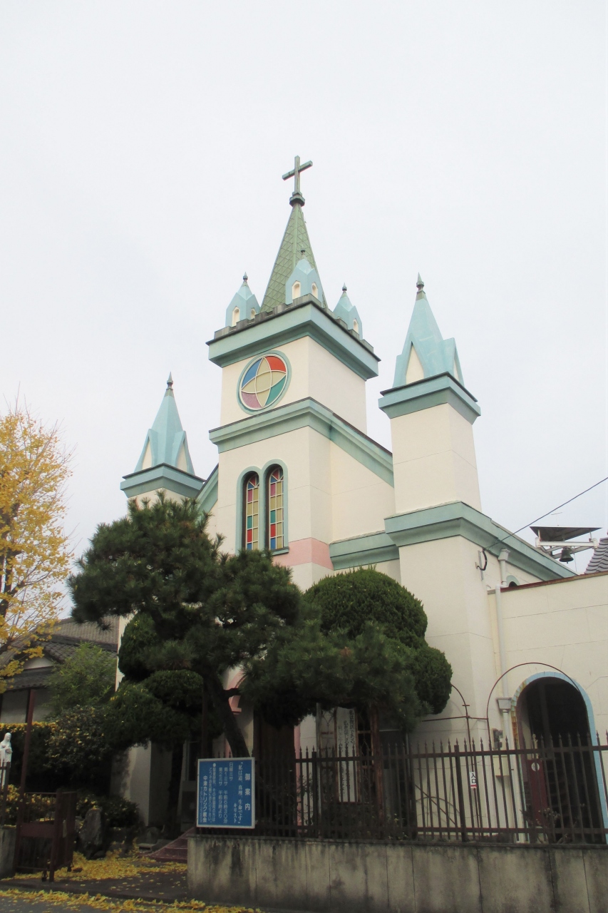 淡い色合いを見た瞬間、お菓子のお城みたいだなぁと思いました。すぐ近くに日本建築の代表の様な中津城があります。お城と教会がずいぶん近い場所なのがちょっと不思議に感じましたが、中津でのキリスト教の始まりは早く、1587年(天正15年)に黒田官兵衛が豊前へ封じられた時だそうです。そういえば、官兵衛は洗礼を受けていましたね。
