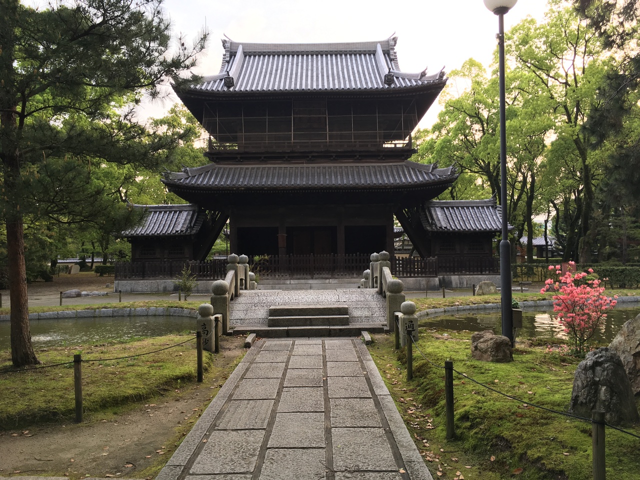 聖福寺は、地下鉄祇園駅から徒歩3分のところにある臨済宗妙心寺派の禅寺です。この寺院は、栄西禅師を開山として1195年に創建された日本で最初の禅寺です。総門から入山し、方丈池、石橋の先にある大きな建物が山門です。二階建ての門です。山門は閉まっていますので下を通ることはできません。現在のものは、1911年(明治44年)に再建されたものです。