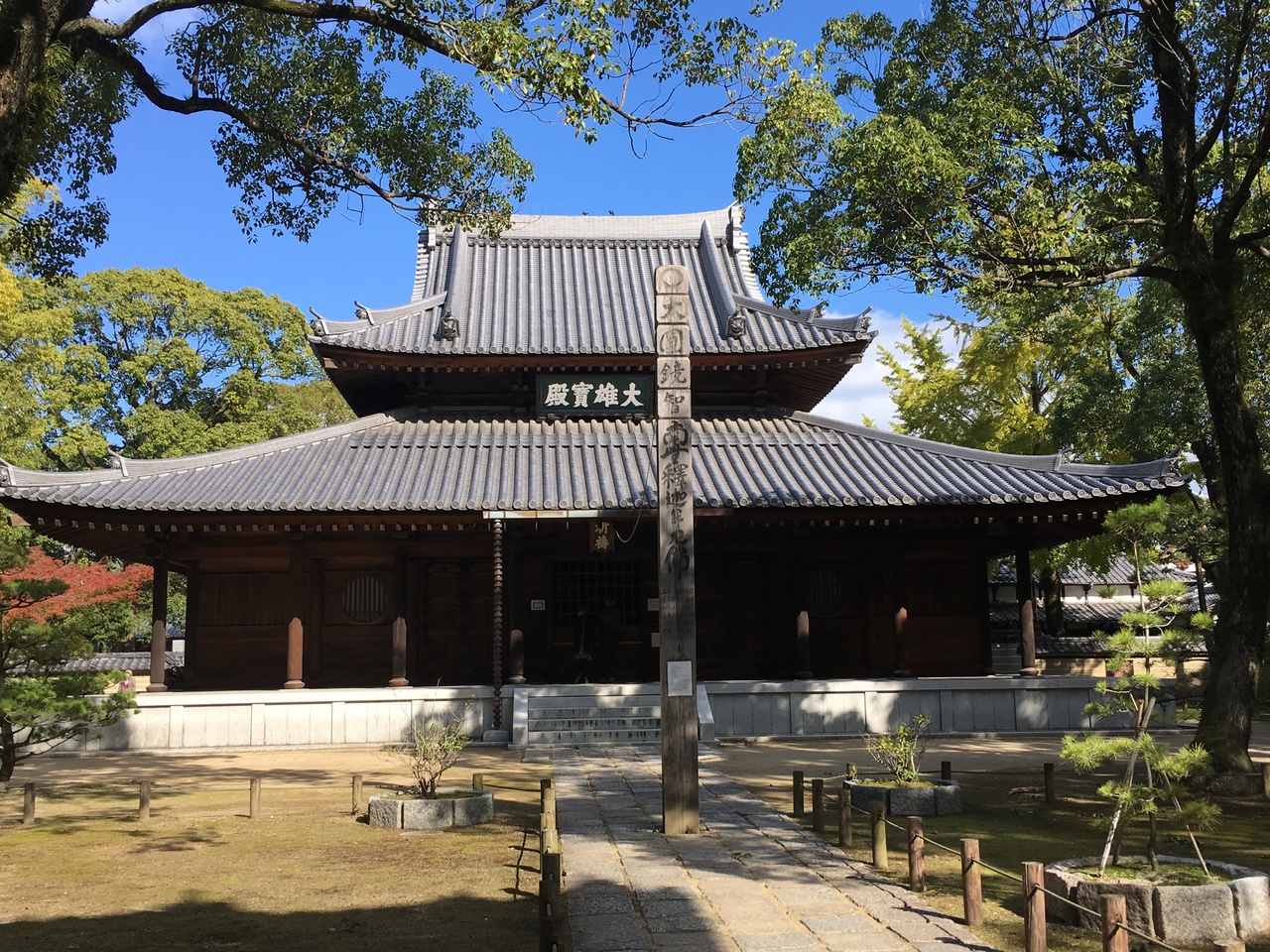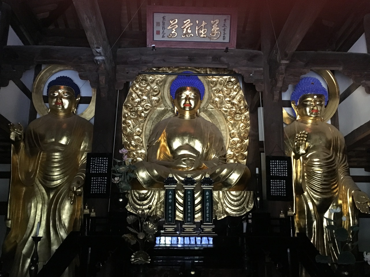 聖福寺は、地下鉄祇園駅から徒歩3分のところにある臨済宗妙心寺派の禅寺です。この寺院は、栄西禅師を開山として1195年に創建された日本で最初の禅寺です。仏殿(大雄宝殿)は、ご本尊を祀るところです。ご本尊は、釈迦如来、弥勒如来、弥陀如来の3如来です(写真参照)。金ぴかの丈六の大きな仏様です。立像で4.8m、坐像で3mのものです。乾漆の仏像としては日本一の大きさとのことです。神社仏閣、仏像に興味がある方は参拝されては如何でしょうか。