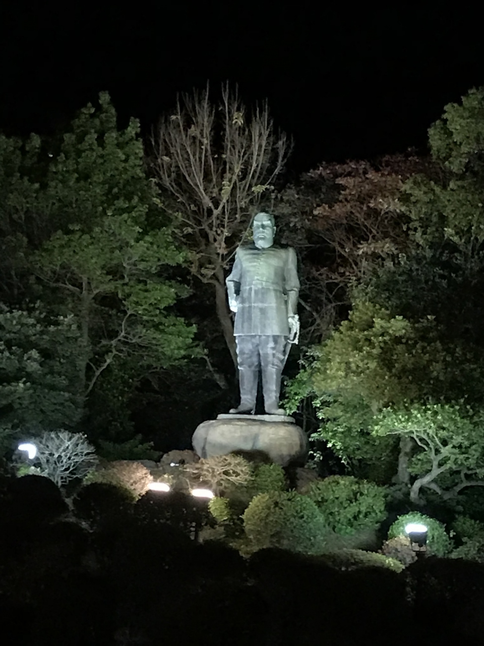二度目の訪問だったので、今度はライトアップされた西郷さんを見たく、夜に訪れました。上野の西郷隆盛像は着物姿ですが、鹿児島の像は軍服を着ています。