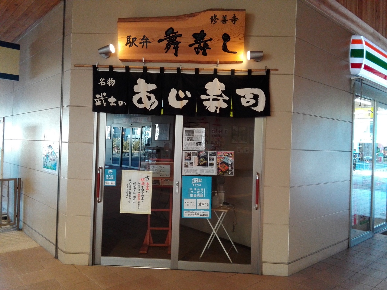 修善寺駅構内、セブンイレブンと背中合わせにあるお店です。駅弁屋さんとありますが、外見はお寿司屋さんです。鯵寿司が有名と聞いて食べたかったのですが、お品書きの看板もなく、開店しているようないないようなで、一歩入れずでした。