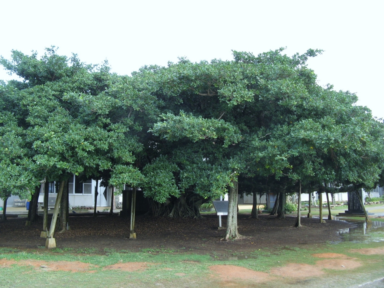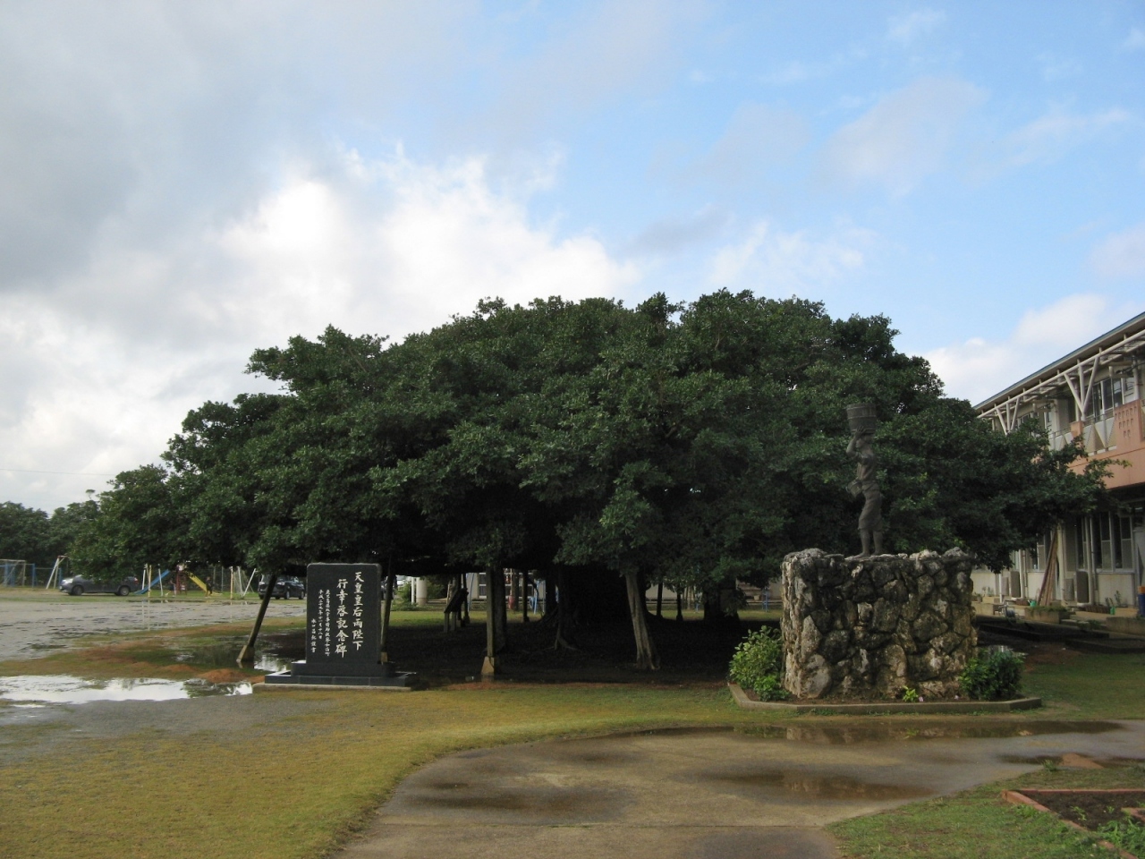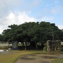 国頭小学校の校舎の傍らにあります。現地にある説明板“添付写真参照”によると、明治31年(1898年)に国頭小学校の第1回卒業生によって植えられたものとか。高さが10mぐらい、枝張りが20mぐらいで校庭に大きく枝を広げています。