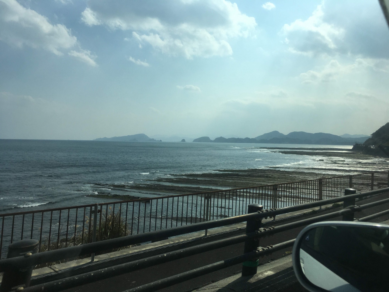 日南海岸に広がる不思議な地形で、地層が重なってギザギザになっているのが傾いて海に削られてできた(と聞きました)。車はもちろん、JRの日南線の車内からでも眺めることができます。海面下の地形なので干潮を狙った方がよく見えるはずです。
