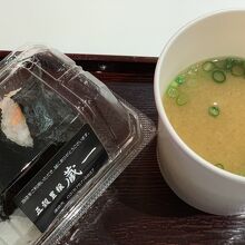 ワンコインでおにぎり2個と味噌汁が付きます。