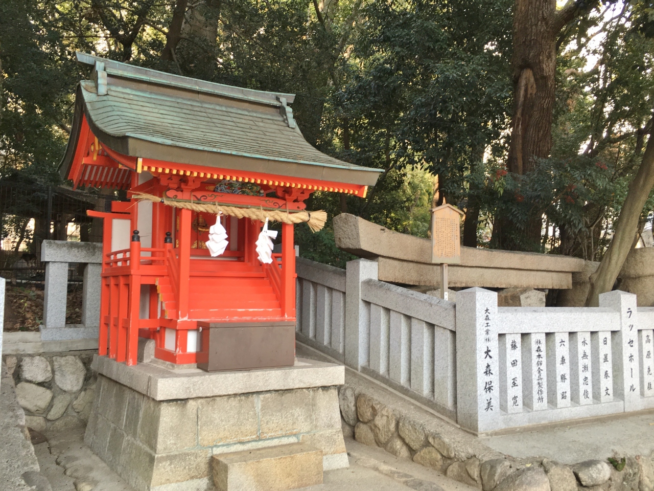 生田神社の裏手に広がる生田の森の側、戸隠神社の東にあります。この鳥居は江戸時代初期に建立されましたが、1853年の大地震で支柱を残して崩壊してしまい、その残骸がここに安置されました。「生田の折鳥居」と名付けられ、交通安全のご利益があるとのことです。礎石は1979年に行われた道路工事で出土したもので、重量は5トンもあるそうです。