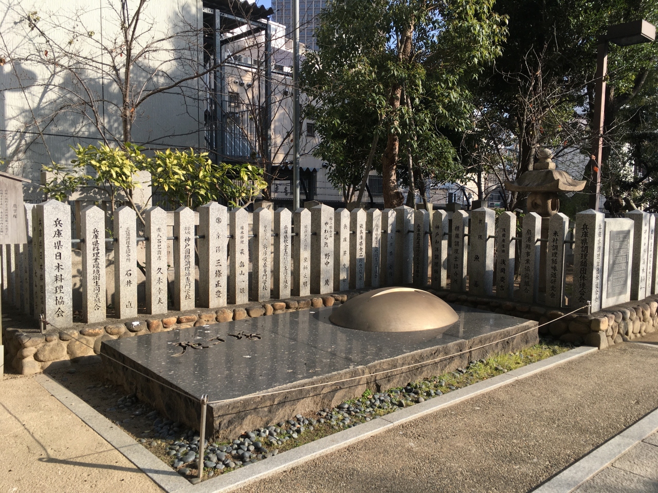 生田の森の東側にあります。皇太子殿下御成婚と神宮式年遷宮の記念事業として、料理に関わる人たちに感謝するとともに、食文化の向上を願って建てられました。生田神社は縁結びの神社として有名ですが、包丁の切るという行為から、縁結びとは反対に悪縁を絶ち縁切りのご利益を授かりたい人々が訪れる場所ともなっているようです。