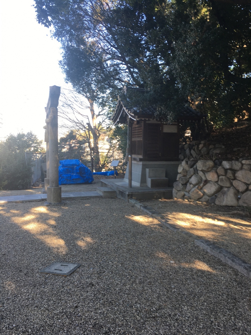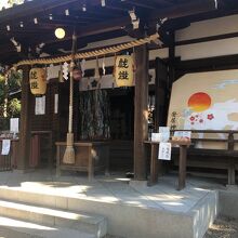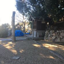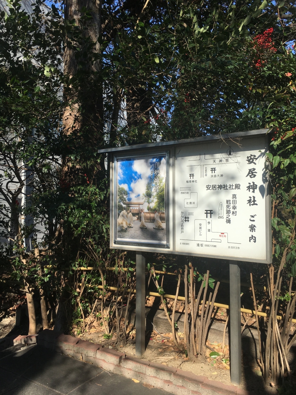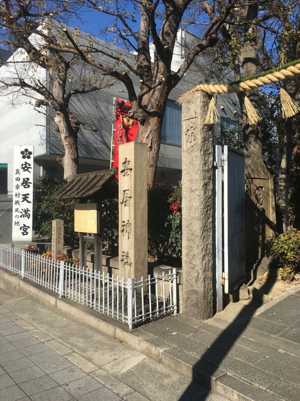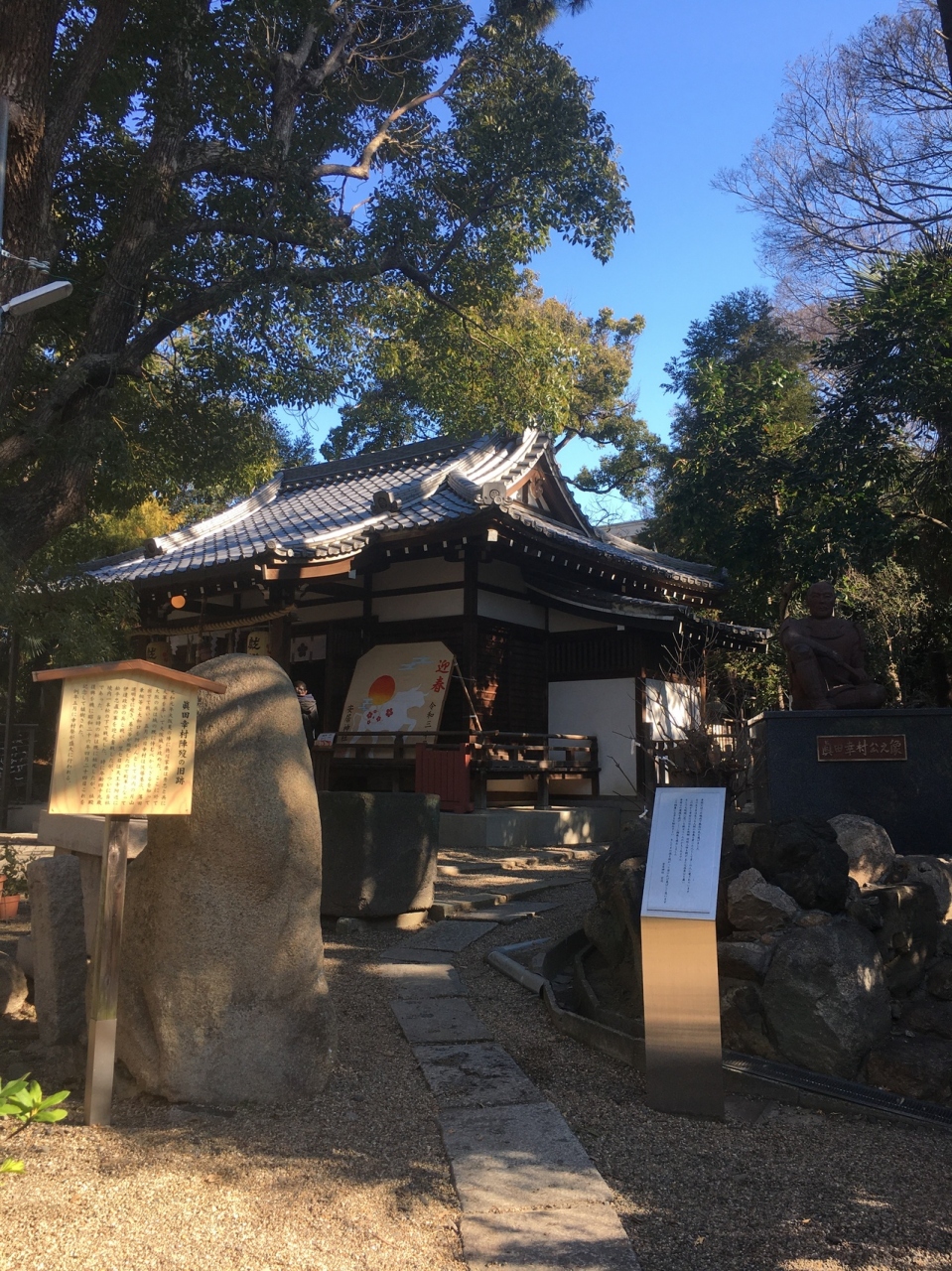 坂道沿いにあり、参道はテニスコートとビルに挟まれた狭い参道でした。鳥居を越えると狭いながら林に囲まれた境内でした。社務所が左にあり、その奥には2つの鳥居があり、急な石段の道が2つありました。真田幸村終焉の地なので歴史ファンぽい人が何人かいました。