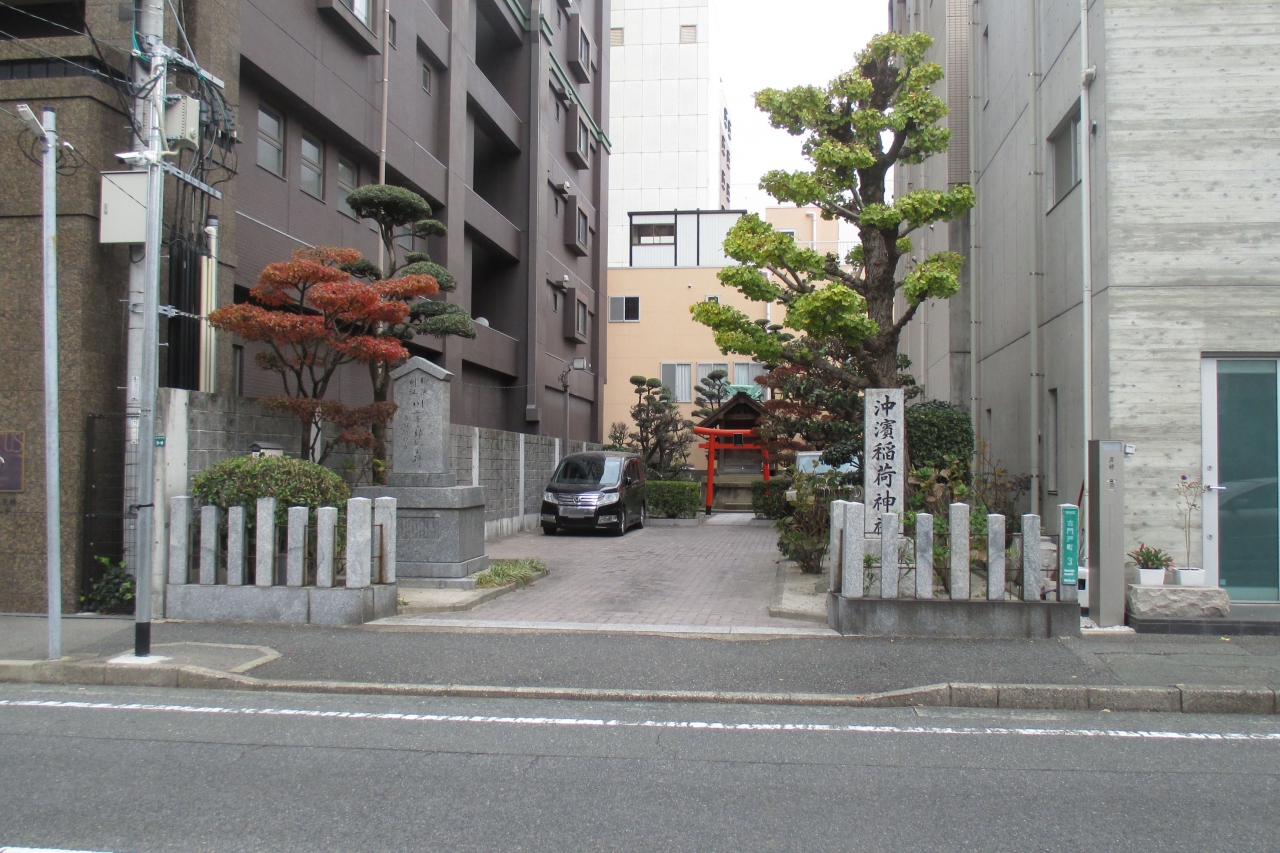ここは、古くは澳の浜と書いて「おきのはま」と呼ばれる地で、806年(大同元年)に空海が唐より海路辿り着いたところなのだそうです。ホッとしてウトウトとしていると、稲荷大明神が現れ、高野山に弘道の本拠を開く様にとの御神託を下したそうです。そこで、この地には光照寿院という大師堂と沖濱(澳の浜)稲荷神社が祀られたということです。戦災で両方とも焼失してしまいましたが、沖濱稲荷神社のみ再建されたとのことです。