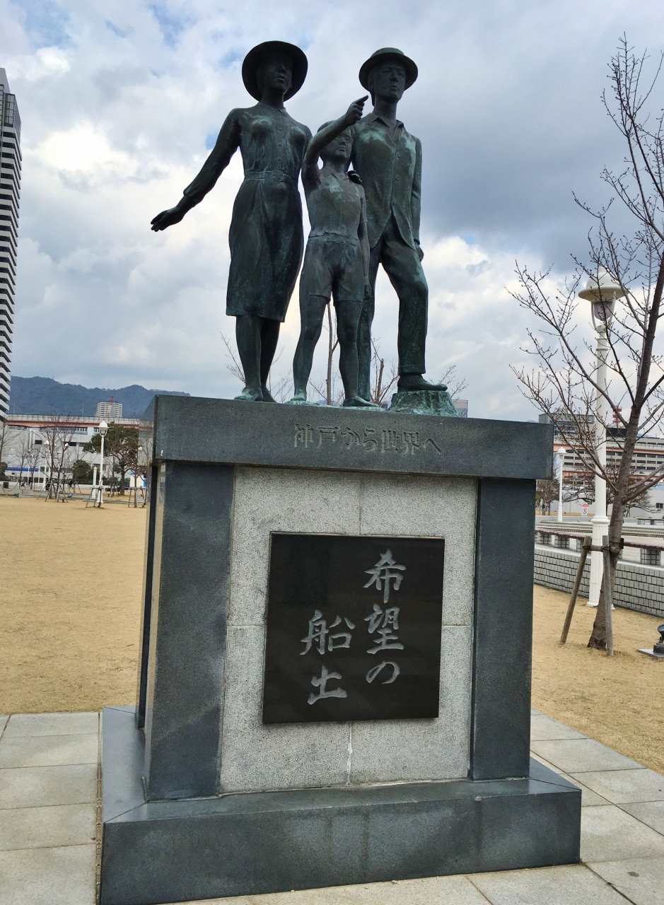 メリケンパークの南、海の近くに3人の家族像があり、銅像の台座には希望の船出と書かれています。1908年に781人を乗せて第1回ブラジル移民船笠戸丸が神戸港から出港しました。新天地での生活を夢見て海外へ渡った多くの日系人の出発点ですが、たどり着いた異国で希望が持てる生活が送れたのか、考えさせられる銅像です。