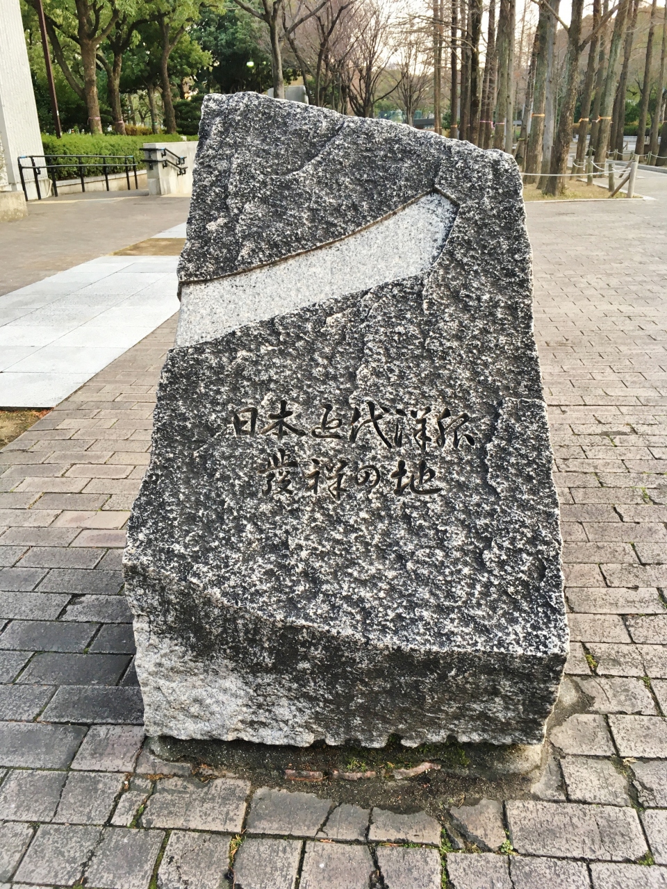 神戸市役所の南にある東遊園地内にあるオブジェです。形が変わっていて、一見何を指しているのか分からなかったです。近くに関連した石碑が置かれています。近代洋服とはタキシードやビジネススーツなど紳士服のことで、神戸初の洋服店は神戸開港の翌1869年旧居留地でイギリス人によって開業したとされています。東遊園地内には他にも様々な記念碑があり、阪神淡路震災に関係した碑も置かれています。