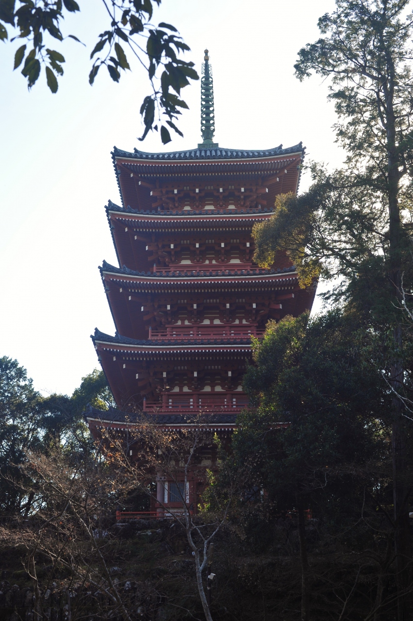 1980(昭和55)年築の新しい五重塔だ。もともと三重塔がそびえていたそうだが、明治期の台風で倒壊したという。中では大日如来を祭っている。高さ31メートルだが、高台にあるのでもう少し高塔な印象がある。竹林寺が全体的に古色なイメージがあるだけに、朱塗りの塔はひときわ目立つ。