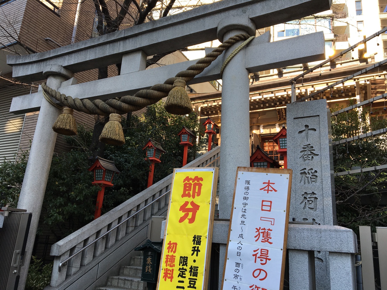 都営大江戸線の麻布十番駅7番出口を出てすぐ隣にある神社です。境内には、大小のカエルの親子の像がありました。「若がえる」「忘れ物がかえる」など、ご利益があるとのこと。ユニークで面白い神社です。厄除けや商売繁盛にもご利益があるとのことでした。