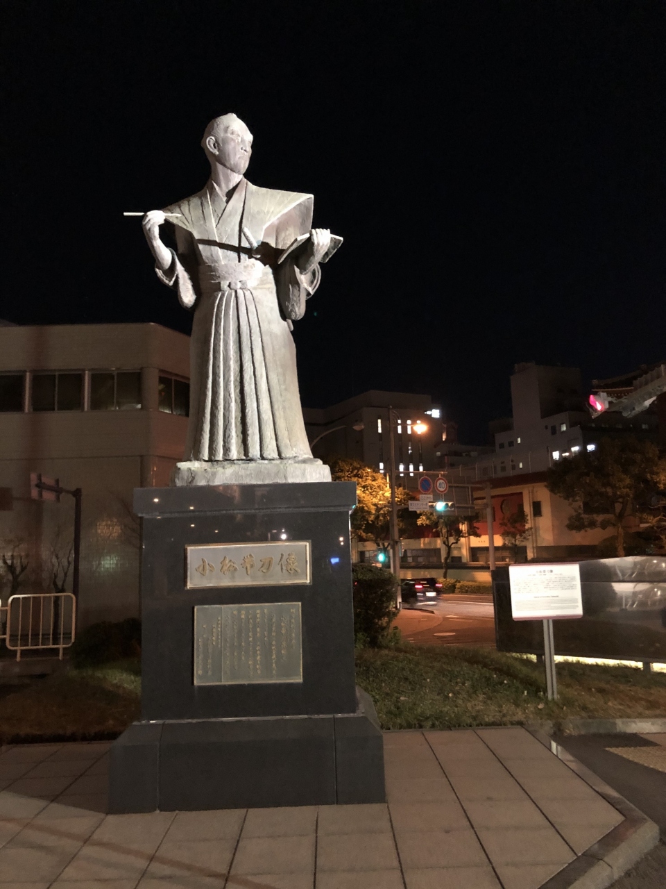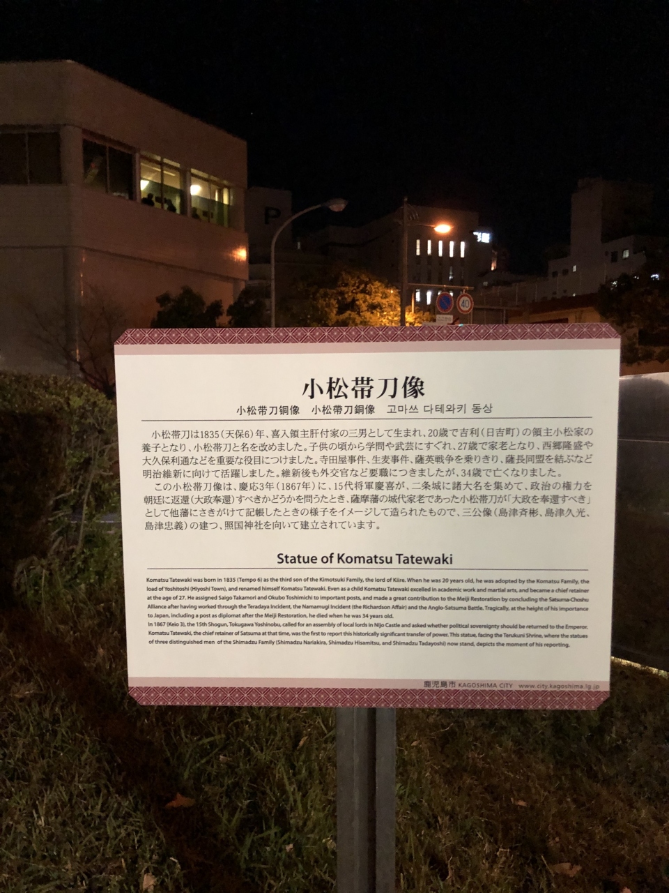 鹿児島は、幕末に偉人を多く輩出しただけあって、鹿児島市内には偉人の像が多いです。この小松帯刀像は、西郷隆盛銅像の近くに設置されていました。鹿児島県文化センターの前です。少し離れてはいますが、西郷隆盛像と、ほぼ向い合うようになっていて、対比が面白いと思いました。