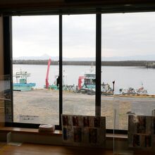 窓の前は鹿屋漁港、先には開聞岳が見える
