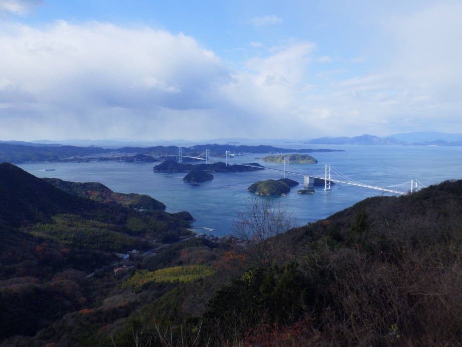 「道の駅 よしうみいきいき館」から10分ほど山を登ると「亀老山展望公園」に到着しました。駐車場には石の亀がいました。展望台からは来島海峡と来島海峡大橋を綺麗に見ることができました。とてもいい景色でした。