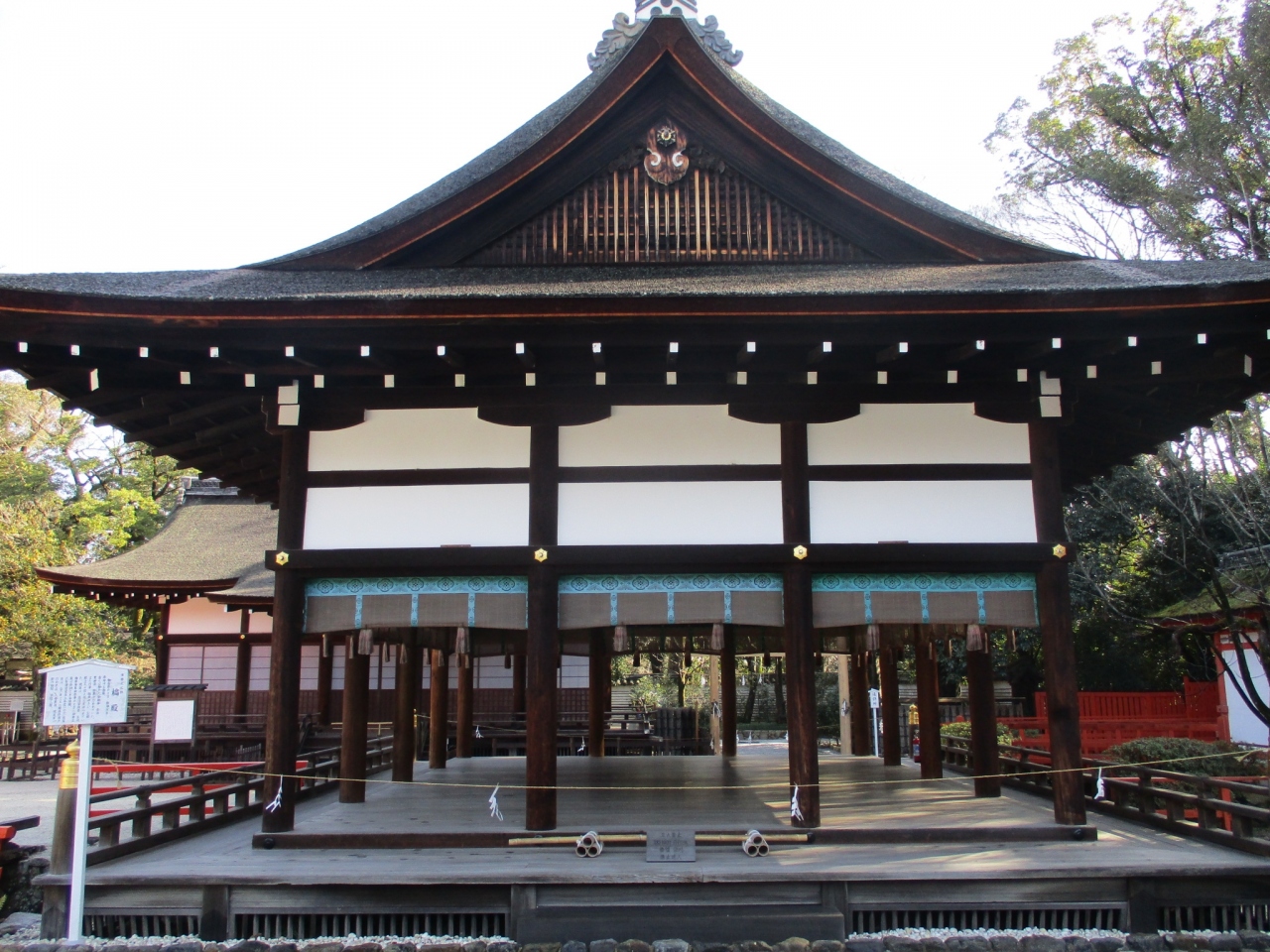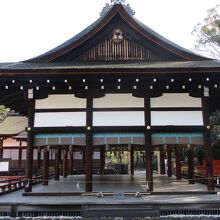 下鴨神社の楼門をくぐり、右側、舞殿と細殿の間の、境内を流れる御手洗川の上に建てられています。御蔭祭のときご神宝を奉安するのに使われる社殿です。葵祭(賀茂祭)の神事のとき、ここで神楽や倭舞が奉納されます。重要文化財です。古式ゆかしい印象です。