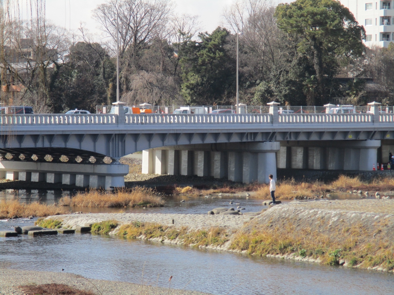 賀茂川と高野側が合流して鴨川になるところにかかっています。欄干に石灯篭のデザインがところどころに配されています。車やバスが多く走っています。今回は車で橋を渡りました。この橋から見る周囲の眺め、とてもよいです。橋は1月現在、一部工事中でした。