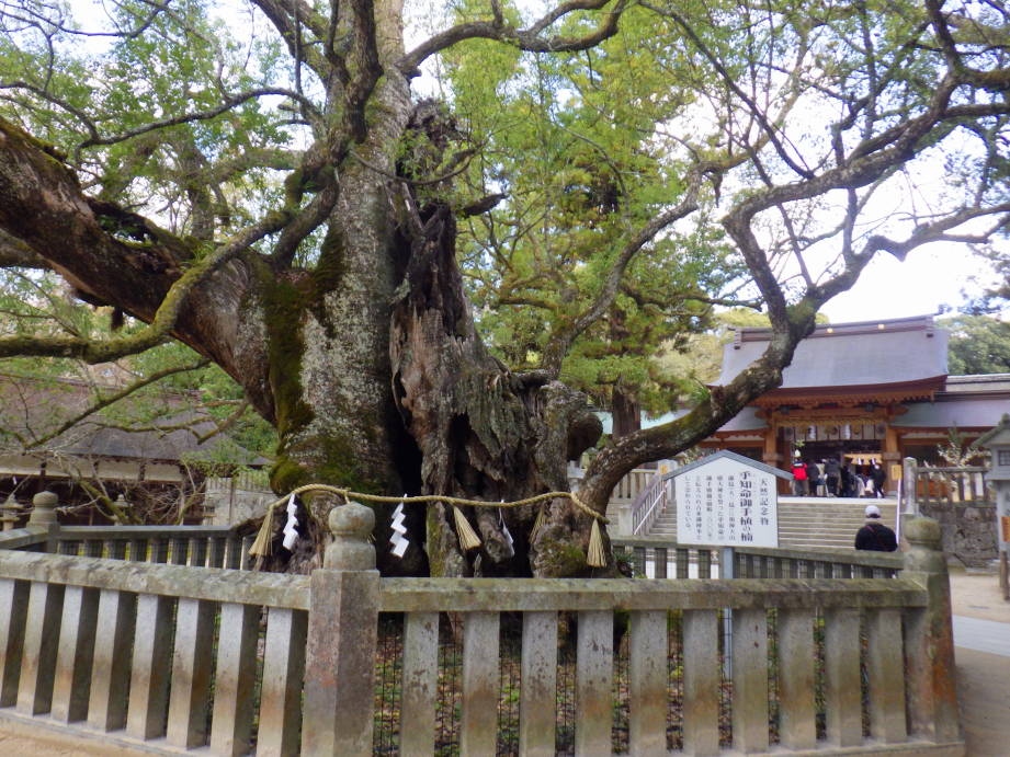 道の駅「多々羅しまなみ公園」から5分ちょっとで「大山祇神社(おおやまづみじんじゃ)」に到着しました。無料の駐車場に車を停めて参拝しました。総門をくぐると、境内には御神木で国の天然記念物に指定されている楠は見ごたえがありました。元旦なのでちょっと並んでいましたが、無事、参拝をすることができました。
