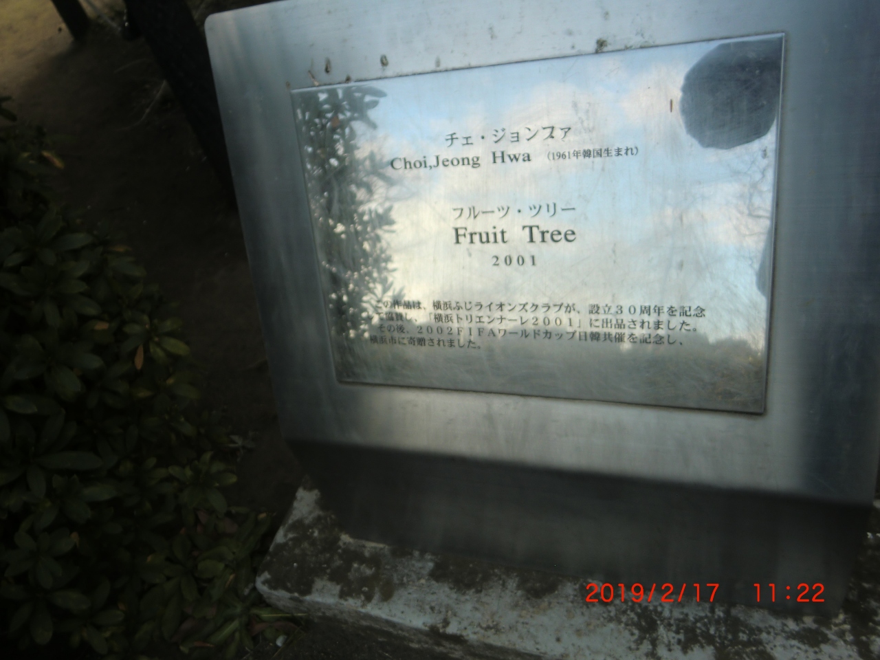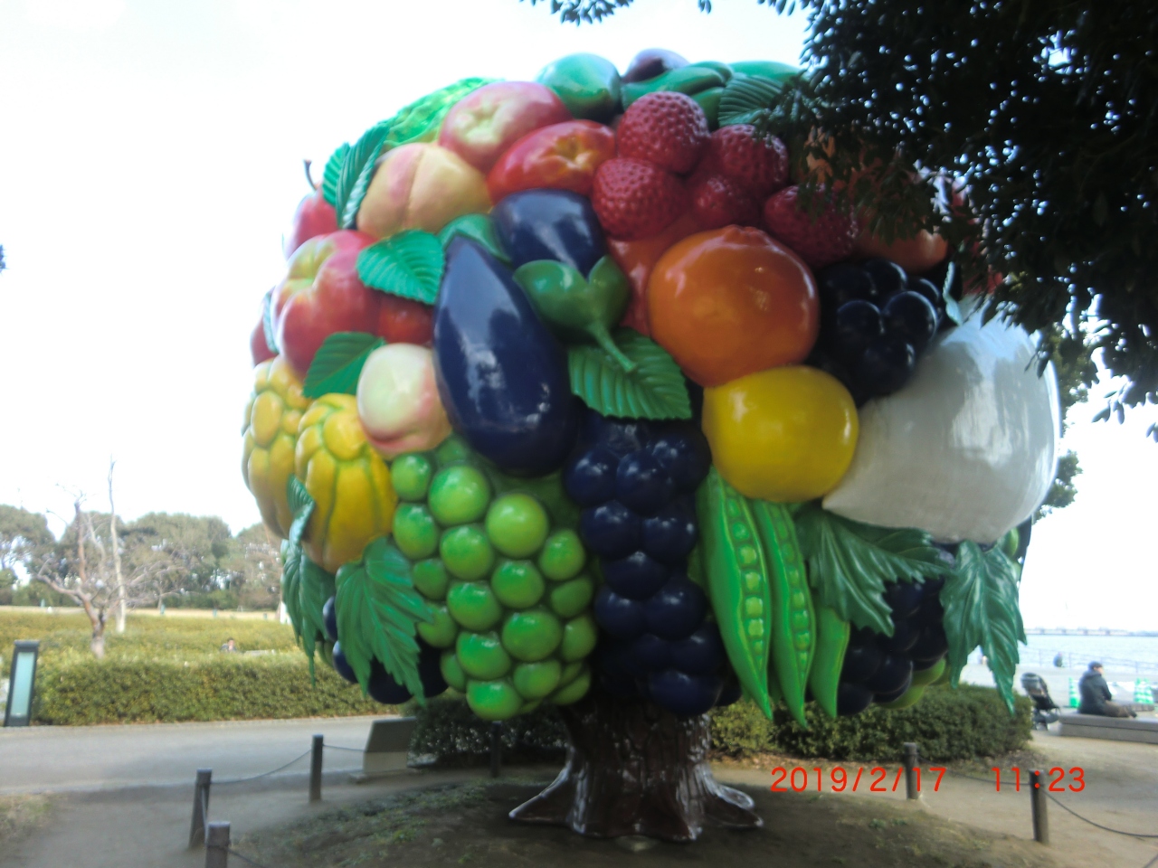 横浜みなとみらい地区の臨港パーク内にあるユニークなオブジェです。タイトルは「Fruit Tree 2001}でした。説明板には、「この作品は、横浜ふじライオンズクラブが、協賛して『横浜トリエンナーレ2001』に出品し、その後、2002年FIFAワールドカップ日韓共催を記念して、横浜市に寄贈されました」と書いてありました。このカラフルなフルーツオブジェの出生が分かりました。