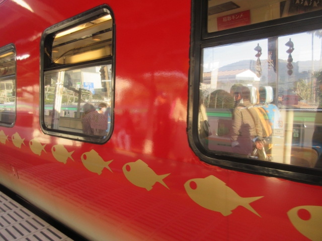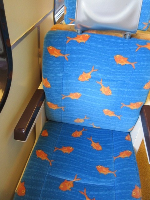 伊豆方面の旅行の際に出会えました。かわいらしいキンメダイをイメージした電車でした。乗車地に害特別料金はかかりません。2人掛け用の向かい合わせの席が取れました。こちら側の席は海側ではないので景色は山が多いけど、密になりにくい席の配置なのでよかったです。