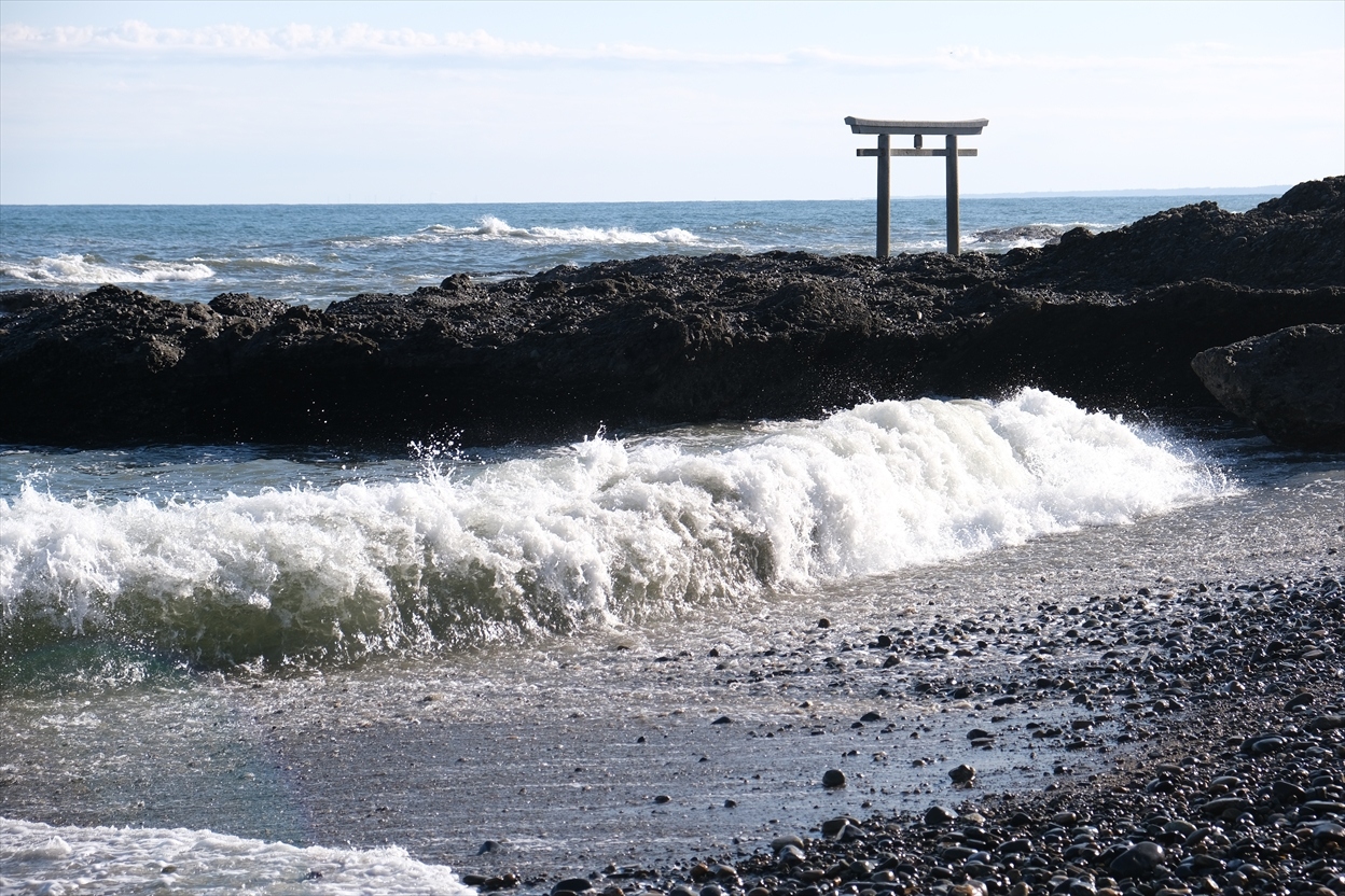 その鳥居がある岩場に太平洋の波が直接打ち寄せる眺めには荒々しいパワーが感じられ、かつてこの海岸は潮湯治の場所だったというのに納得。