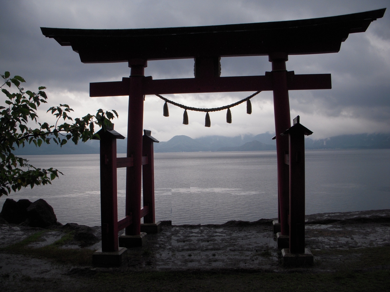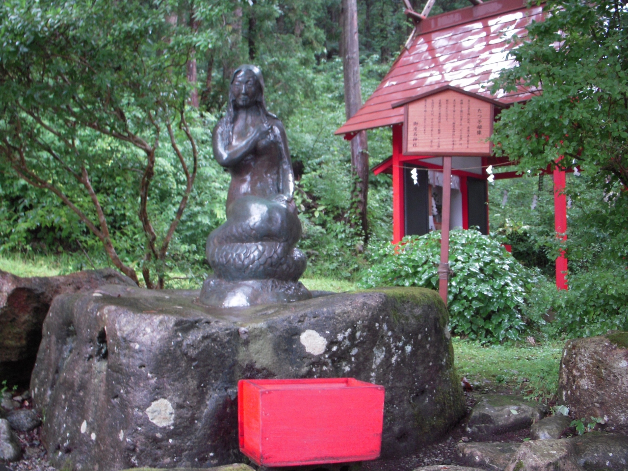 朱塗りの鳥居のそばには、1本の木から7種類の木が生えた「七色木」や、たつこが飲んで龍となった「潟頭の霊泉」、たつこが姿を映した「鏡石」などの名所もあります。
