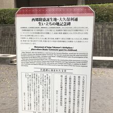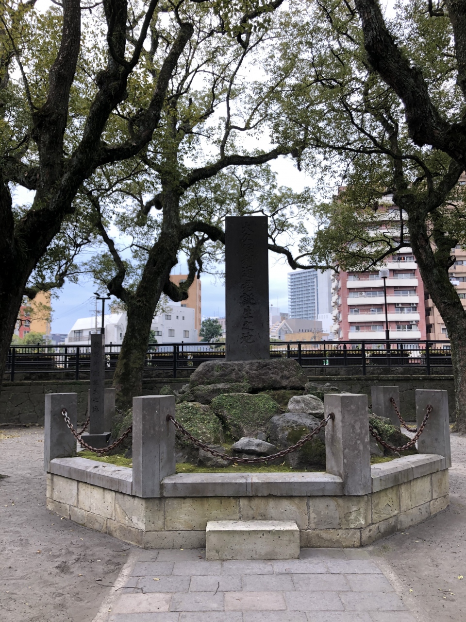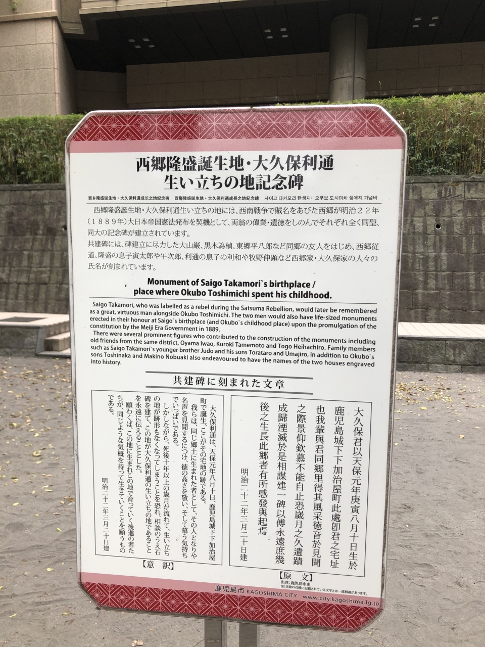 「維新ふるさとの道」を散策中に見つけました。維新ふるさと館の隣です。鎖で囲まれた立派な碑でした。碑には「大久保利通誕生之地」と刻まれていたので、てっきりここで生まれたのかと思いましたが、生まれたのは別の場所で、ここは幼少期を過ごした所になるそうです。すぐ近くに大久保利通像があるので、併せて訪問すると良いと思います。