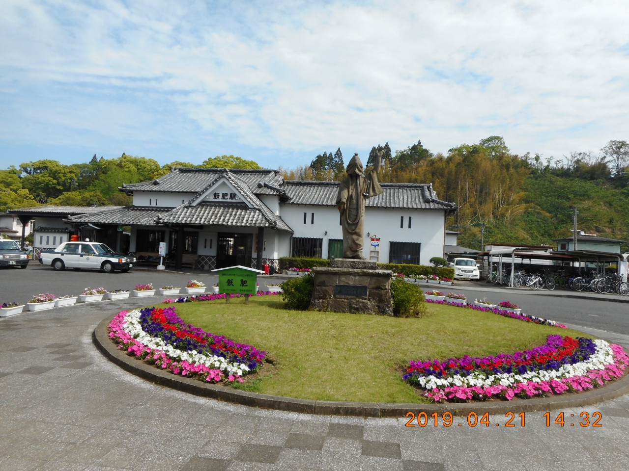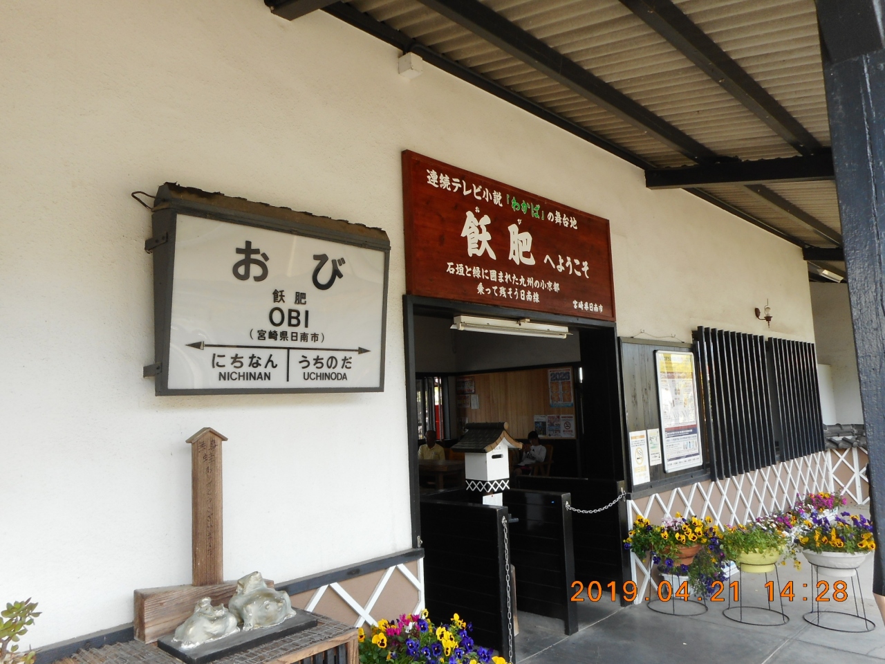 JR日南線で子供の国から飫肥駅に着きました。NHKの連続テレビ小説「わかば」の舞台となった場所で、「石垣と緑に囲まれた九州の小京都」と駅に表示されてました。住所的には日南市になるようです。駅前のロータリーの像と駅舎が良い雰囲気を醸し出していました。