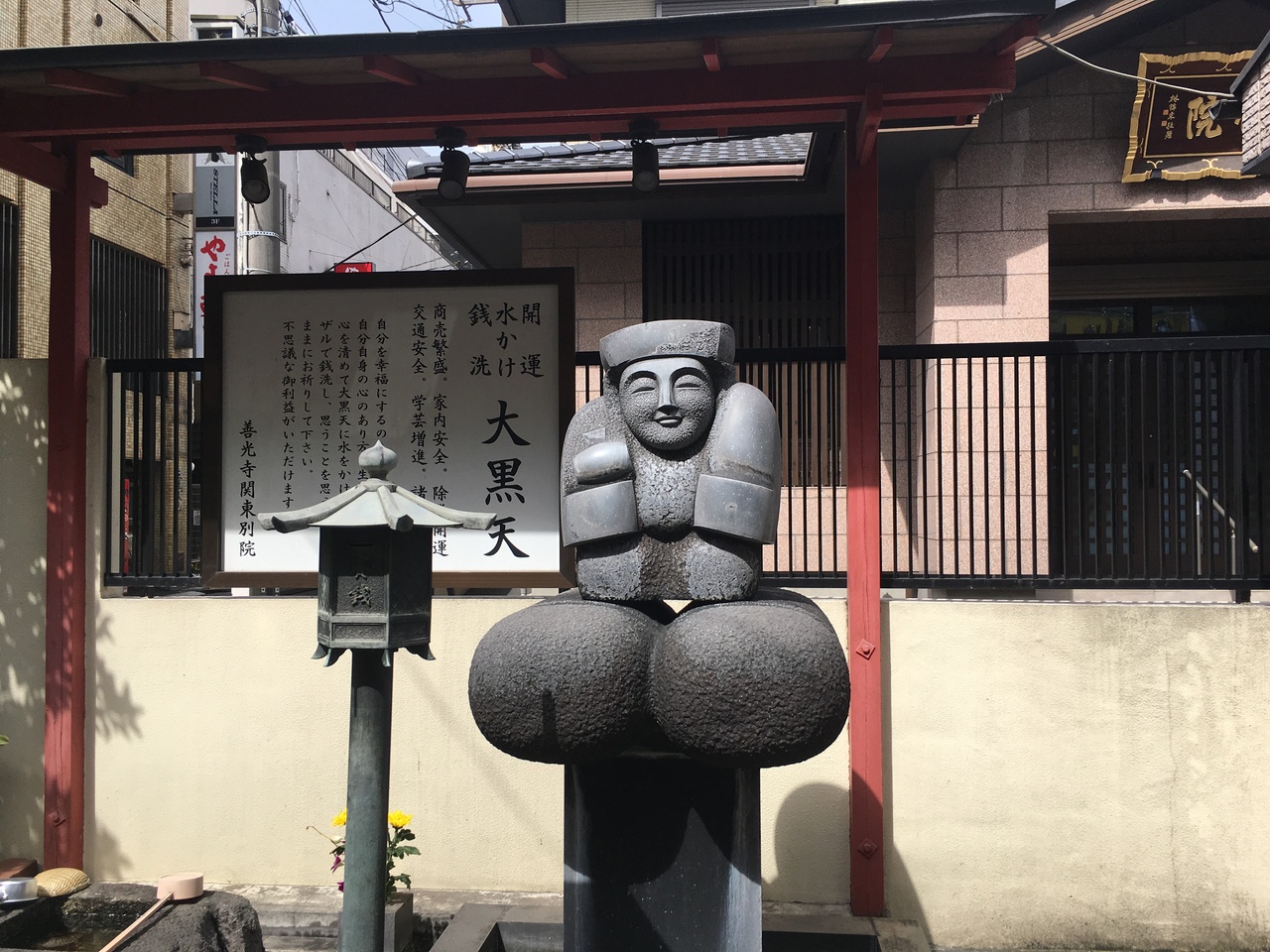 観行院は、京急川崎駅から徒歩5分くらいのところ、仲見世商店街の一角にある天台宗の寺院です。信州善光寺の関東別院です。この寺院の創建年代等は不詳ですが、慈覚大師が開基と伝えられています。山門が閉まっており境内には入れませんが、門外にユニークな形の大黒天がありました(写真参照)。大黒天に柄杓でお水を掛け、さらにザルで銭洗いをするとご利益があるとのことです。