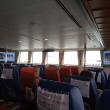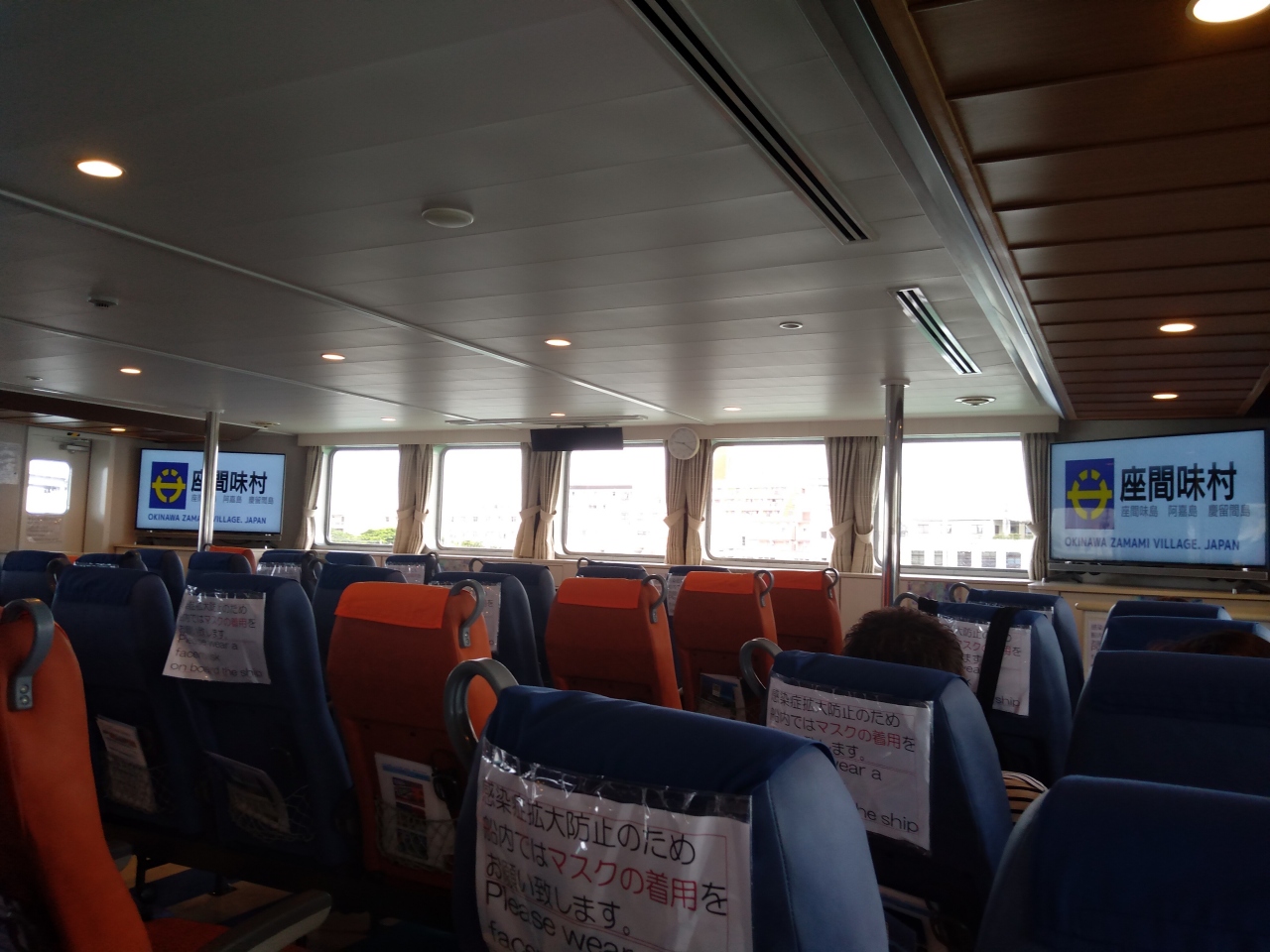 とまりんから慶良間諸島の阿嘉島、座間味島を結んでいるフェリーです。シーズンともなると当日でも乗れないくらいの混雑になります。今回はコロナ化の影響で利用客も少なく、また1席ずつ開けてソーシャルディスタンスを保ちながらの席の利用です。それでも空席だらけでした。