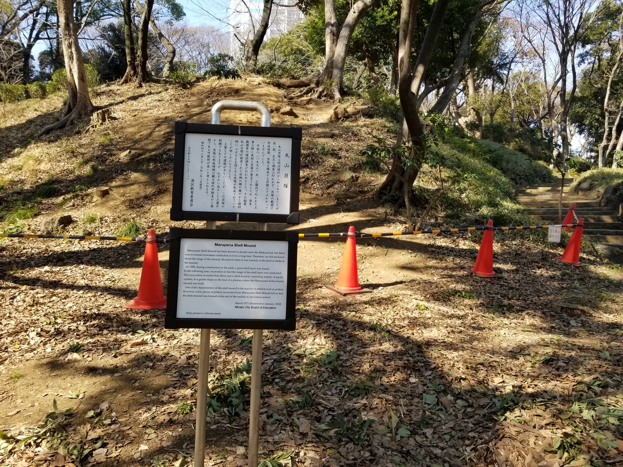 丸山古墳の東南斜面にはさらに歴史が古い丸山貝塚がある。縄文時代中期の終わり、あるいは後期のものと推定されている。