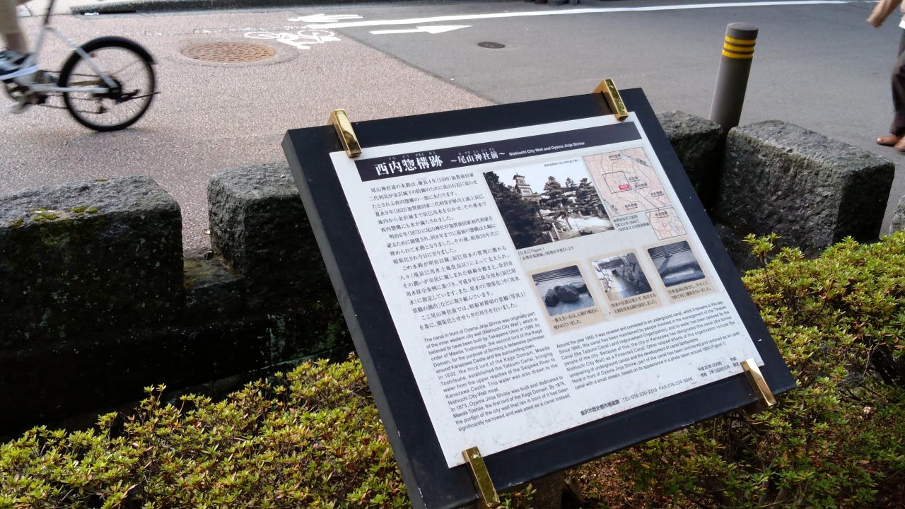 金沢に滞在中こちらの場所を訪れました。金沢市内に残されている何か所かの惣構のひとつが尾山神社前に有りました。二代目藩主の前田利長が金沢城下を防御するために高山右近に造らせた西内惣構堀の一部です。今でも水の流れを見ることが出来ました。