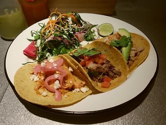 少ししてやってきたタコス。チキン、ビーフ、ポークと3種が楽しめます。チキンが一番好きかな。ビーフもおいしかったけど。ポークは結構、脂を感じるジューシーさなので好きな人はいいかも。
