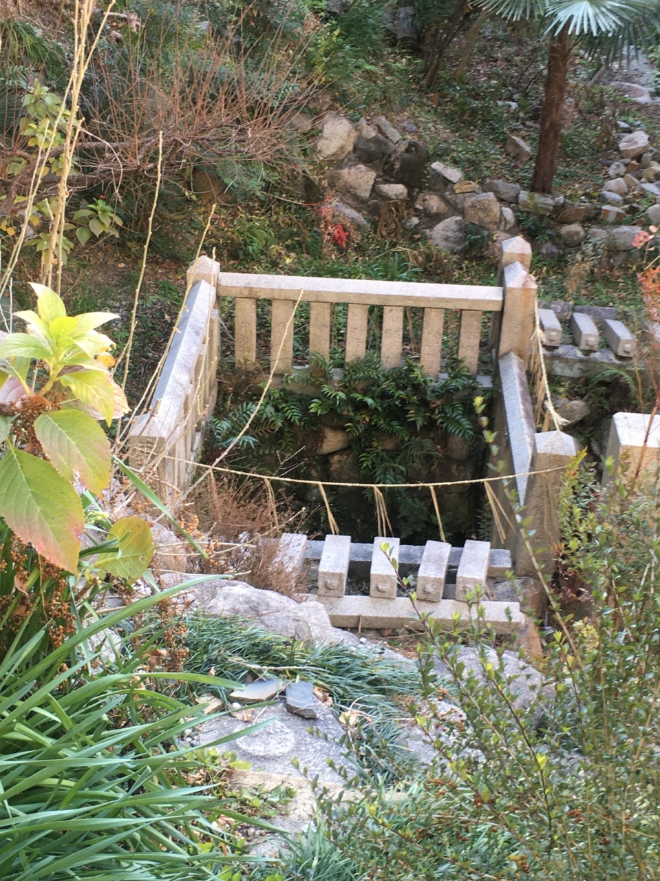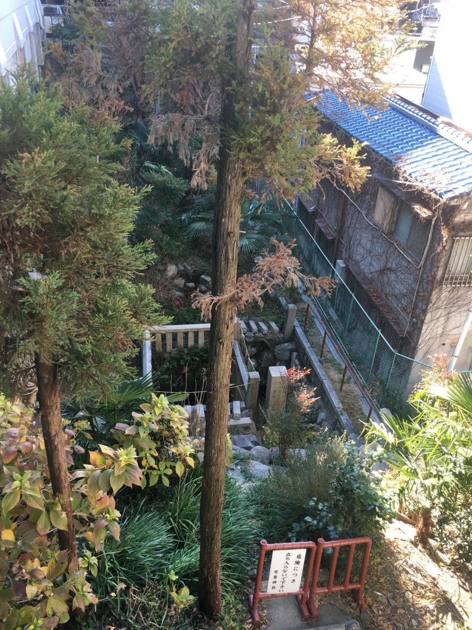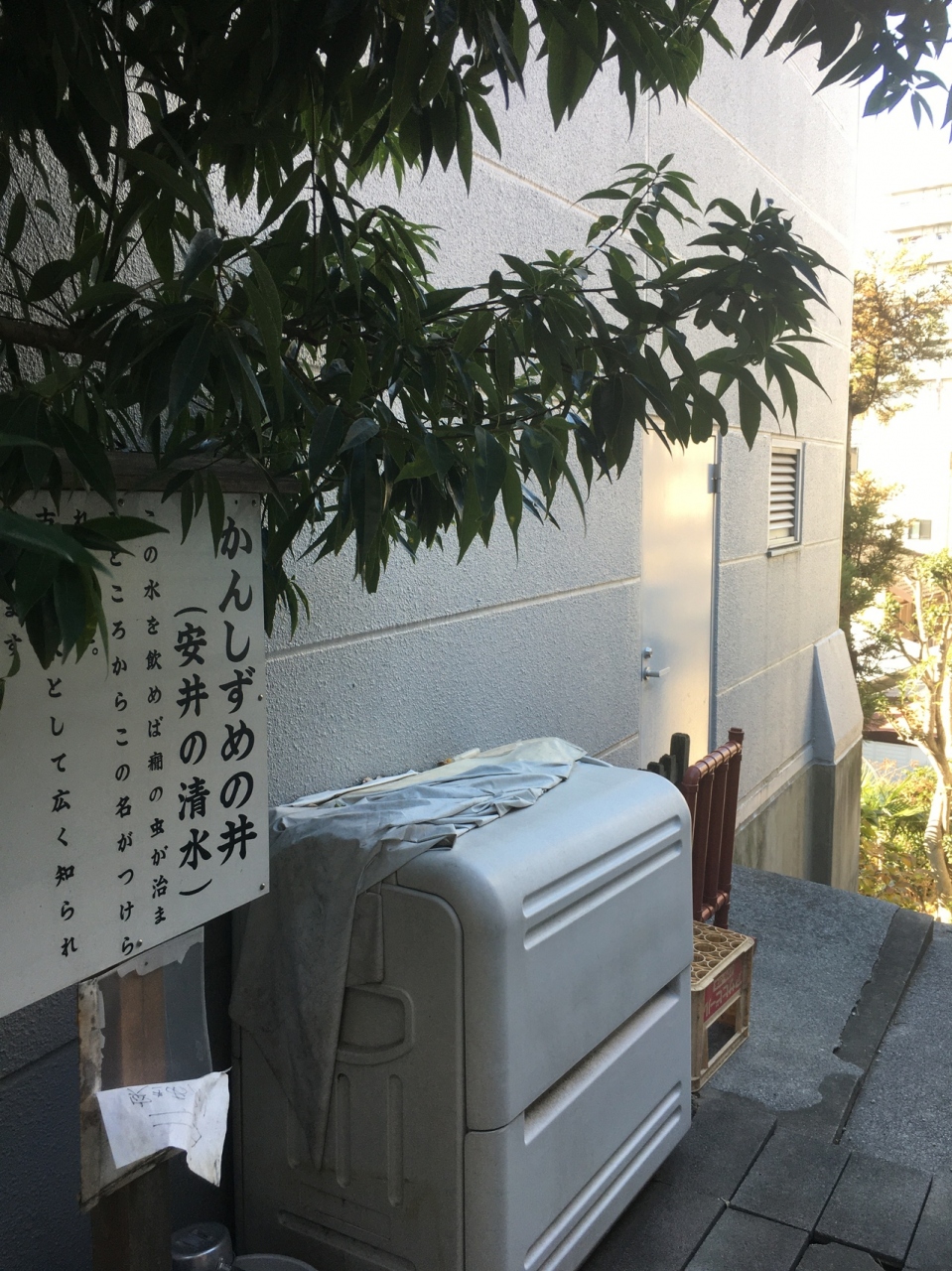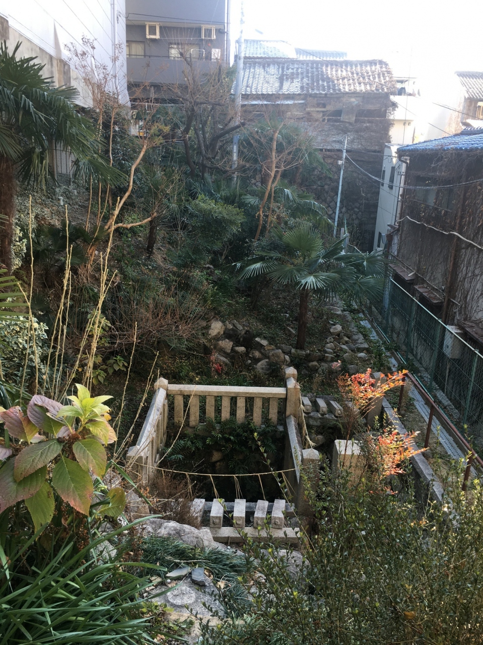 社務所の裏手からの見学となり近くまではいくことが出来ず、上から見下ろすこととなります。囲いに囲まれて奥の部分は見えず、水が出ているかは分かりませんでした。周りには大きな石が転がり防空壕のような感じにも見えました。