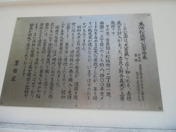 当地で赤穂浪士による仇討ち事件が起こり、その名所を惜しんだ地元の両国3丁目町会有志会が発起人となったのがきっかけとなり「吉良の首洗い井戸」を中心に土地を購入し、本所松坂町公園として残されています。