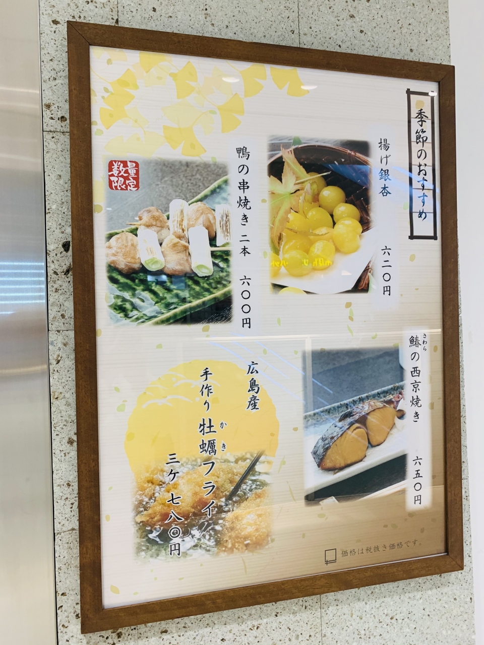 季節のおすすめ 「揚げ銀杏」 「鰆の西京焼き」「鴨の串焼き」「手作り牡蠣フライ」などなどありました。