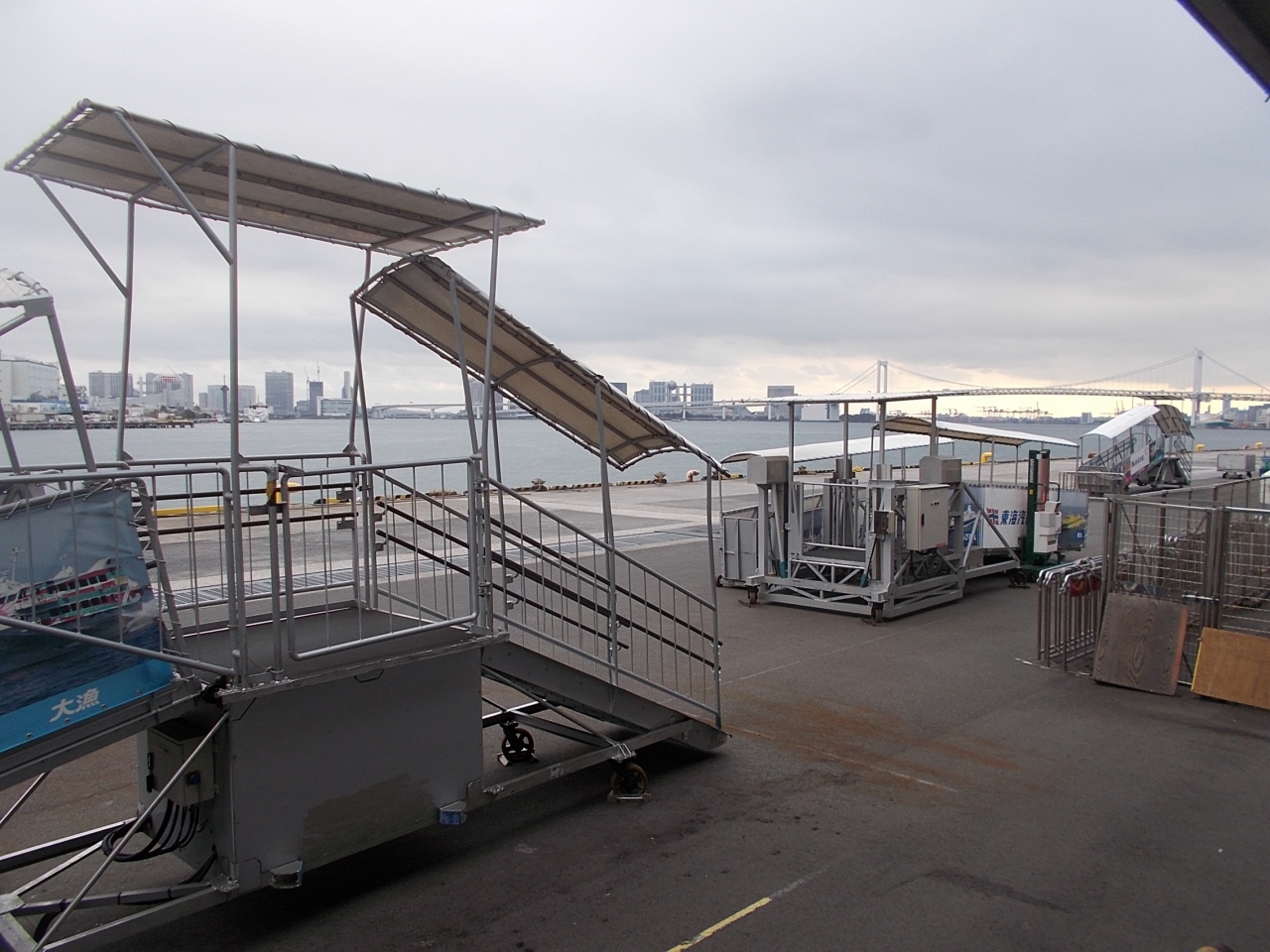 この竹芝桟橋は東京モノレールゆりかごめの竹芝駅からすぐです。JR山手線浜松町駅東口から15分程度です。ここの桟橋からは伊豆七島への定期便が出ています。桟橋は船が出港する時間にあわせてゲートが開きます。ここからは近くは大島そして遠くは父島までの船がd利しています。送るのは寂しいです。