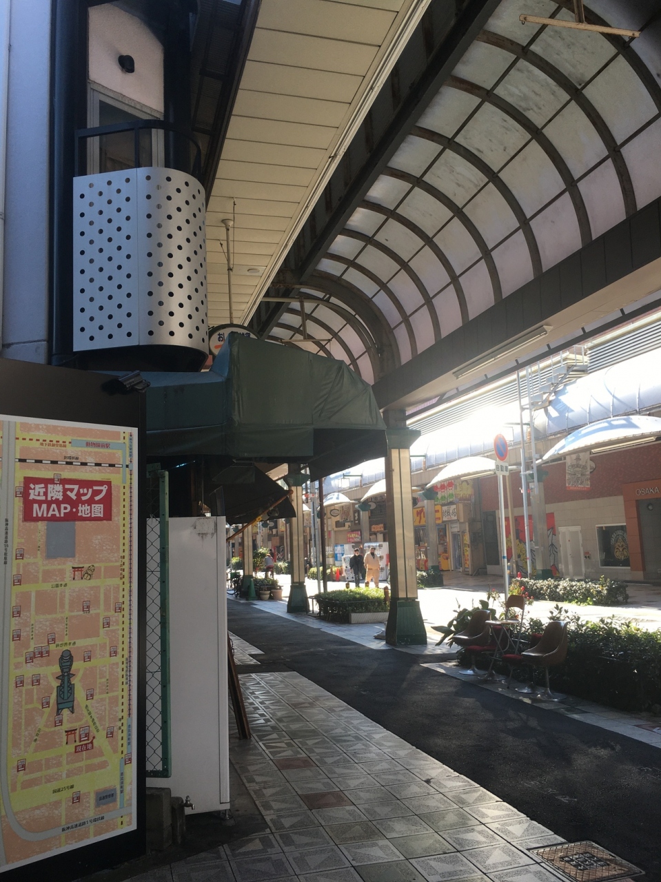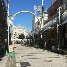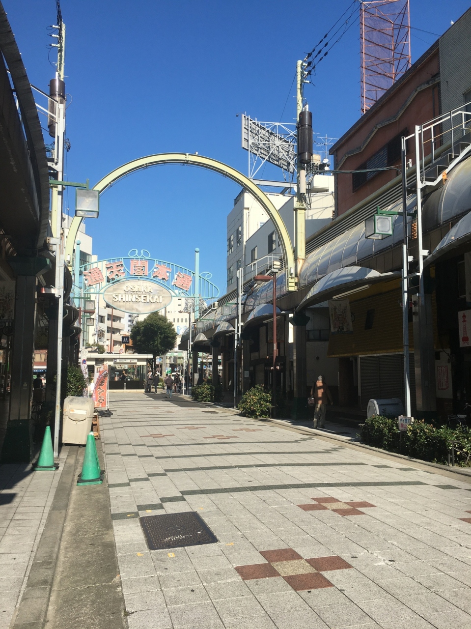 恵美須町駅から通天閣までの商店街で、道幅が広いせいか人が多かったにも関わらず、ごちゃごちゃ感がない、ゆったりとした通りでした。目の前には通天閣が聳え、圧巻の眺めでした。商店街には飲み屋が多くあり、喫茶店もあります。