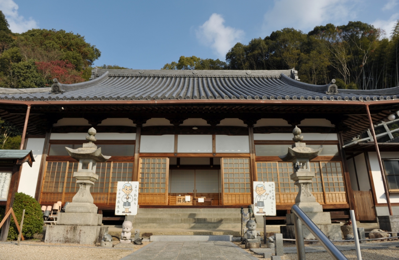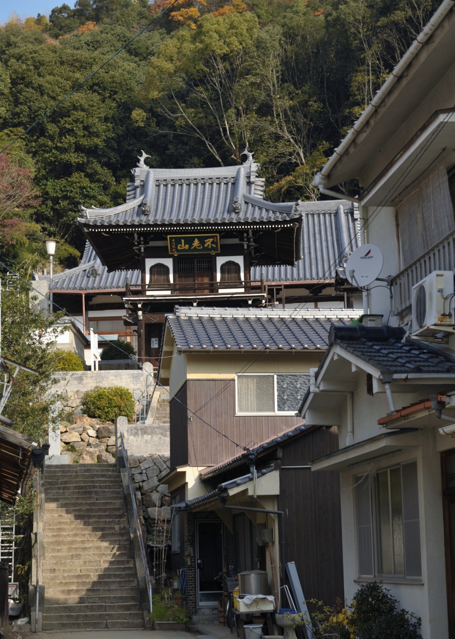 伊予国の戦国大名だった河野氏の最後の当主である河野通直が弔われている。河野家は毛利家の庇護のもとで何とか永らえていたが、1587年の豊臣秀吉の四国攻めで小早川軍に降伏。通直は竹原に流された直後に病死した。毛利両川の一人であり豊臣政権の中で道直の後見人的立場であった小早川隆景は病没をいたみ、寺領を寄進して寺を開創したという。現在は真言宗のお寺だ。多様な信仰を集めているとみられ、境内には大師堂や金毘羅さん、さらには石占いの一つである「お抱え地蔵尊」などの塔頭があった。高台にあり、山門の鐘楼門は威風堂々。