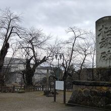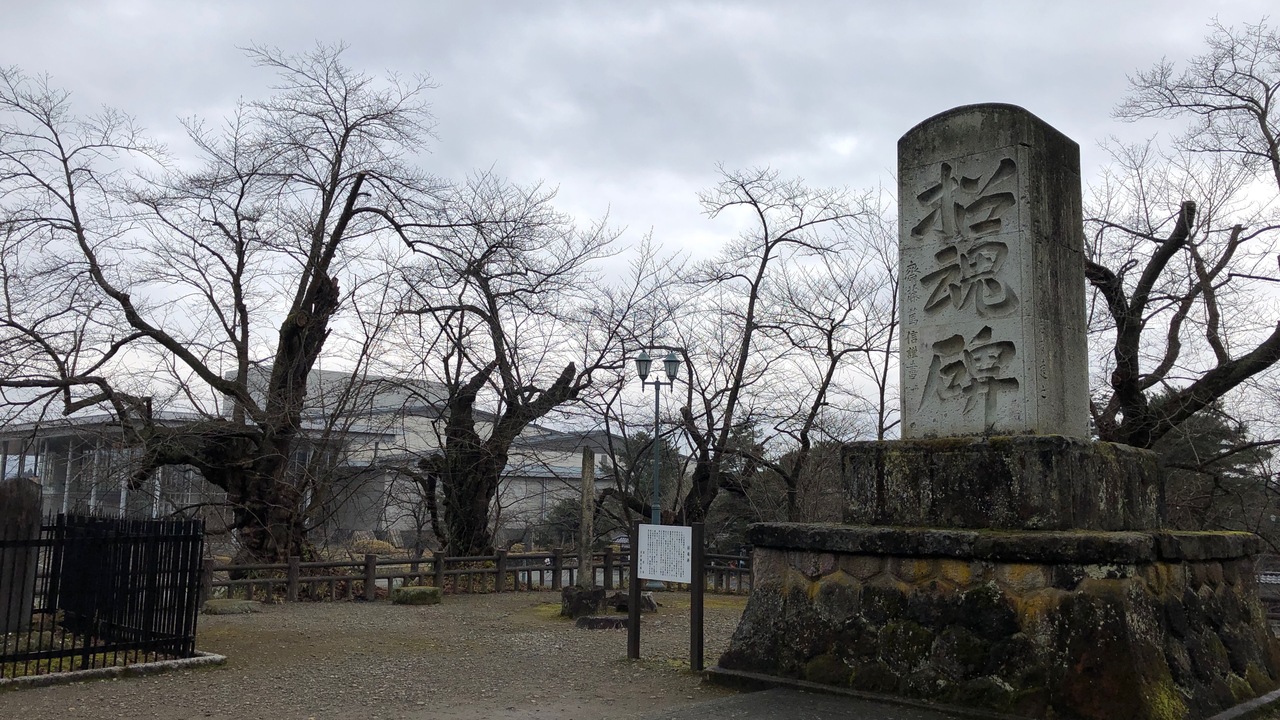 上杉神社にある、大きな石碑です。「しょうこんひ」と読みます。小高い丘の上にあります。戊辰戦争や西南戦争、日清・日露戦争で亡くなった人たちを合祀しているそうです。石碑の周りは桜の木で、春には花見客で賑わいます。