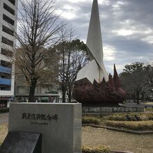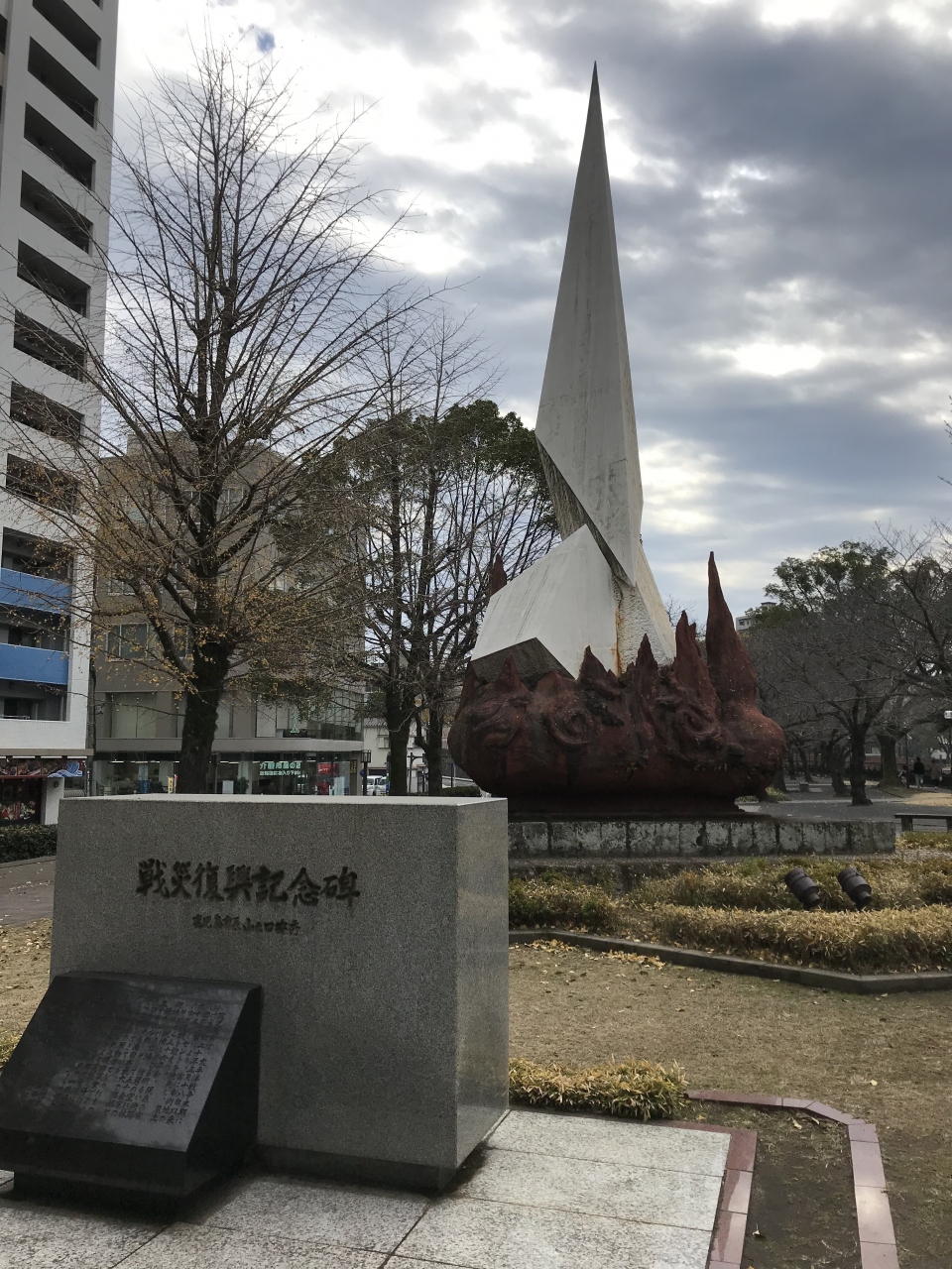 鹿児島市は太平洋戦争で甚大な被害を受けましたが、そこから復興を遂げたことを記念してつくられた碑だそうです。下の赤い部分は戦禍の炎を想像させるもの、さらにその上の白い部分は空に向かっていて、まさに復興をイメージしていると感じました。
