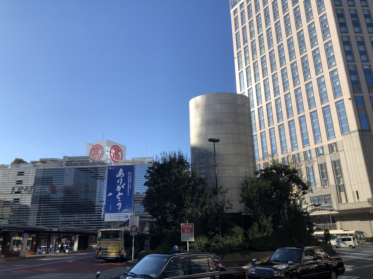 横浜駅西口広場(バスターミナル)の真ん中にある高さ20mの塔です。1986年に造られ、以後横浜駅のシンボル的な存在になっています。楕円形の形をした塔の周囲は木で囲まれていて、木の中から塔が顔を出しているといった光景です。