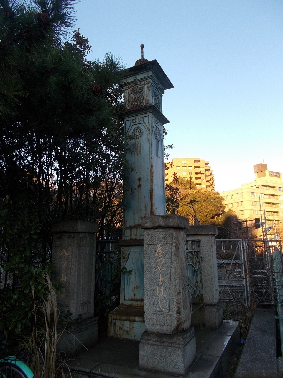 この八ツ山橋 旧橋親柱はJR山手線及び京浜東北線の品川駅西口から南に約10分程度にある八ツ山橋のたもとにたてられています。この旧橋親柱は現在の鉄骨の陸橋に変えられるときに残されたのです。歴史を感じさせる景観です。橋の南側にあります。