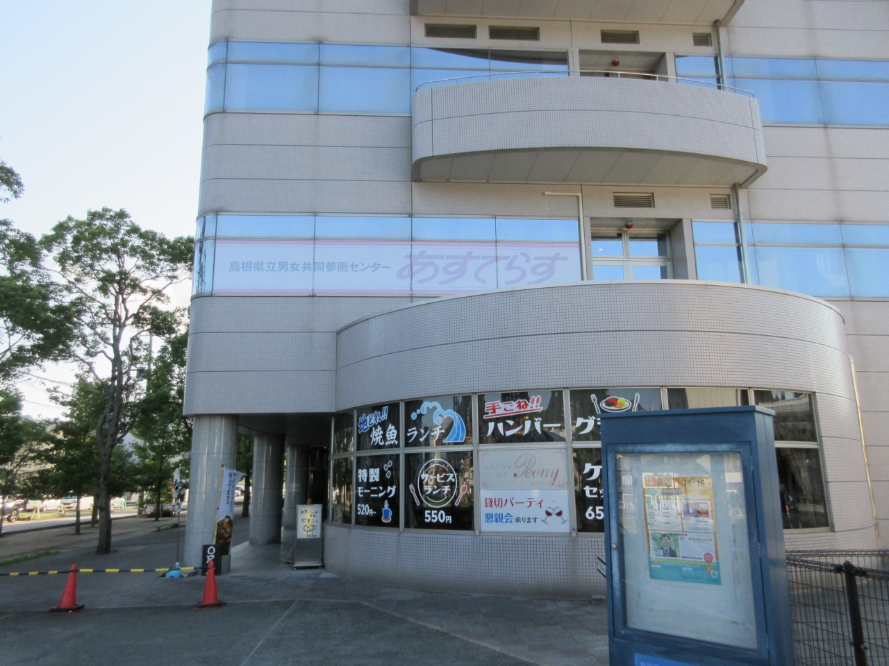 石見銀山を見に行った帰りに,電車の待合時間を使って利用しました.駅の近くにあるのはここくらいなので,余り選択肢はないと思いますが,気軽に入れて便利だと思います.場所は島根県立男女共同参画センターあすてらすというビルの1Fにあります.メニューは軽食と喫茶がメインのようで,今回はアイスコーヒーだけの注文でしたが,380円と安価でした.