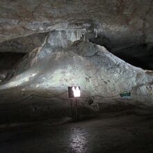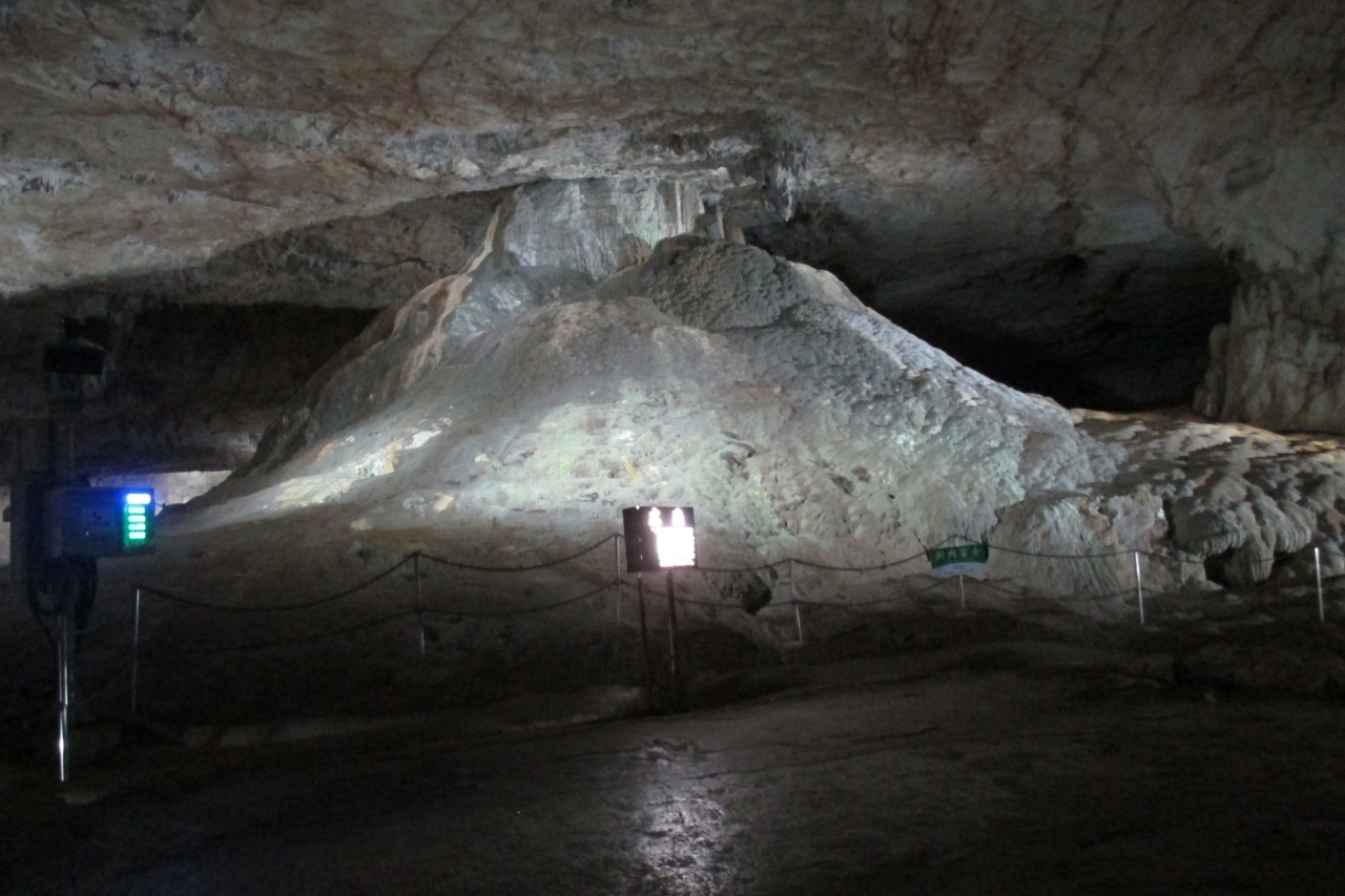 洞内富士は「広庭」と呼ばれているところにありました。洞内では2番目に広い空間とのことです。もうどのくらい歩いてきたのか感覚がなくなってきていますが、ここは約400mだそうです。ここはその広庭ではなく、富士山型の「洞内富士」がポイントです。形からは柱という感じはありませんが、鍾乳石としては石柱(石筍)なのだそうです。