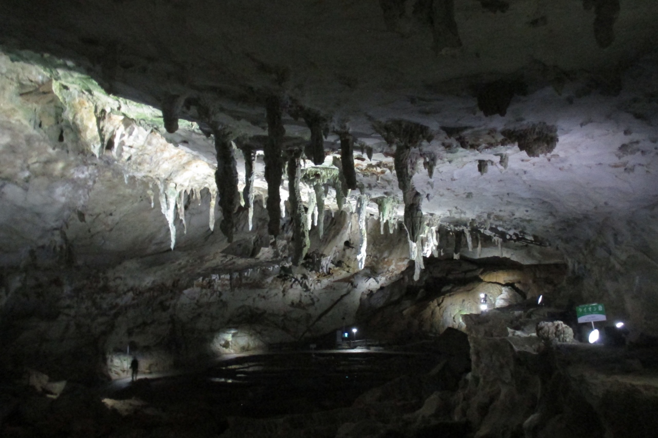 傘づくしは名付けた人のセンスを疑いたくなるポイントです。大体、皆さん、えっ、どれが、どこが・・・と悩むところだと思います。。天井からたくさんの細い鍾乳石が垂れ下がっていますが、これが、昔の傘屋の様だというのです。その傘屋に天井にぶら下げられていた傘のように見えるのだそうです。まぁ、名付けてしまったものはしょうがないですね。近くにはライオンには見えないライオン岩とか、今にも折れそうな大黒柱とか意味不明な命名がありますから、これだけにクレームを付ける訳にはいきません。