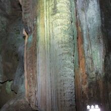 黄金柱は黒谷支洞への分岐点近くにありました。入口からだと約650mくらい進んで来たところとなるそうです。秋吉台の地下100mだそうです。高さ15m、幅4mの巨大な石灰華柱で、正に、秋芳洞のシンボルです。これだけのものを造るのにどのくらいの年数が掛かったのでしょうか、何万年、何十万年でできるのでしょうか?